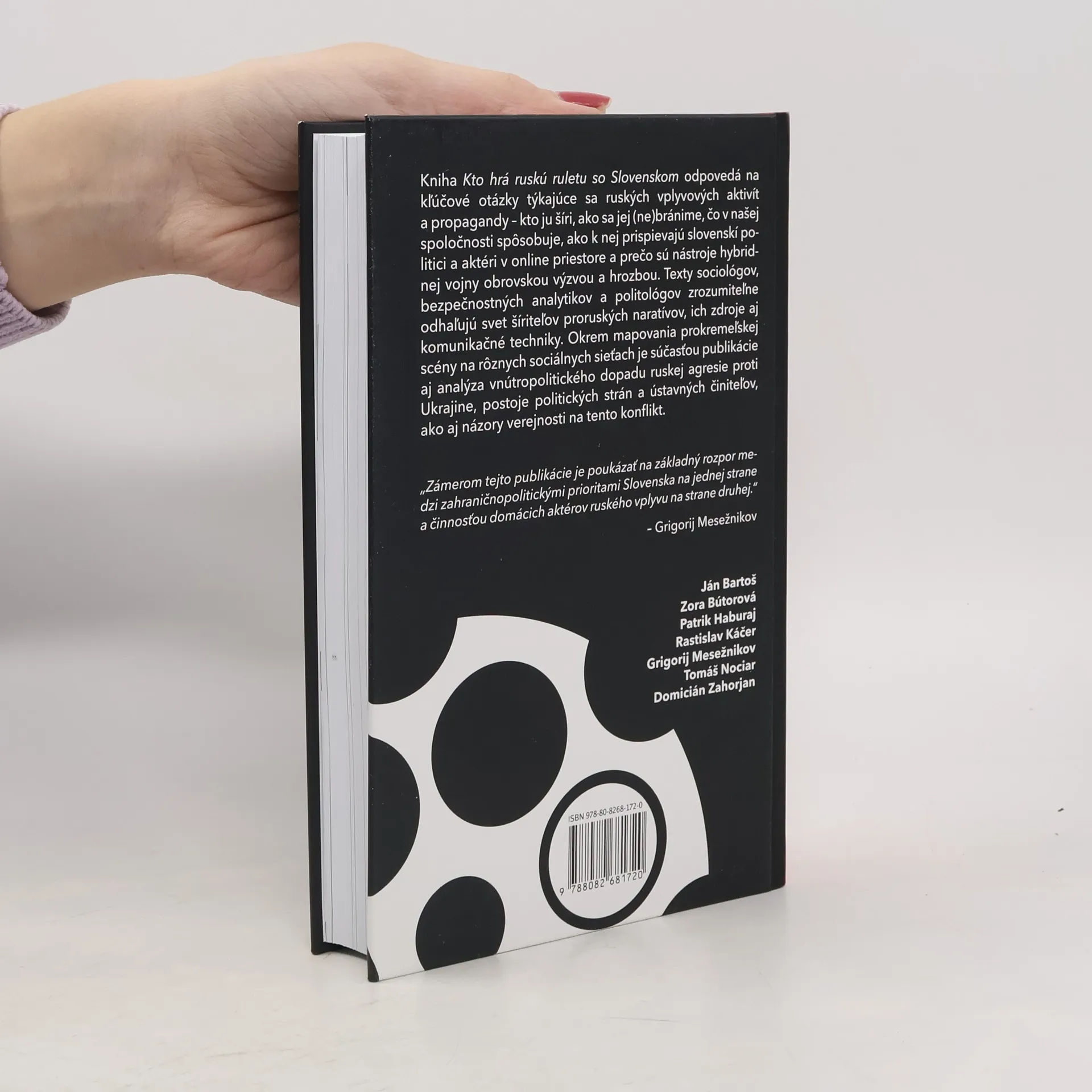 Kniha Kto hrá ruskú ruletu so Slovenskom odpovedá na kľúčové otázky týkajúce sa ruských vplyvových aktivít a propagandy – kto ju šíri, ako sa jej (ne)bránime, čo v našej spoločnosti spôsobuje, ako k nej prispievajú slovenskí politici a aktéri v online priestore a prečo sú nástroje hybridnej vojny obrovskou výzvou a hrozbou. Texty sociológov, bezpečnostných analytikov a politológov zrozumiteľne odhaľujú svet šíriteľov proruských naratívov, ich zdroje aj komunikačné techniky. Okrem mapovania prokremeľskej scény na rôznych sociálnych sieťach je súčasťou publikácie aj analýza vnútropolitického dopadu ruskej agresie proti Ukrajine, postoje politických strán a ústavných činiteľov, ako aj názory verejnosti na tento konflikt.„Zámerom tejto publikácie je poukázať na základný rozpor medzi zahraničnopolitickými prioritami Slovenska na jednej strane a činnosťou domácich aktérov ruského vplyvu na strane druhej.“Grigorij Mesežnikov