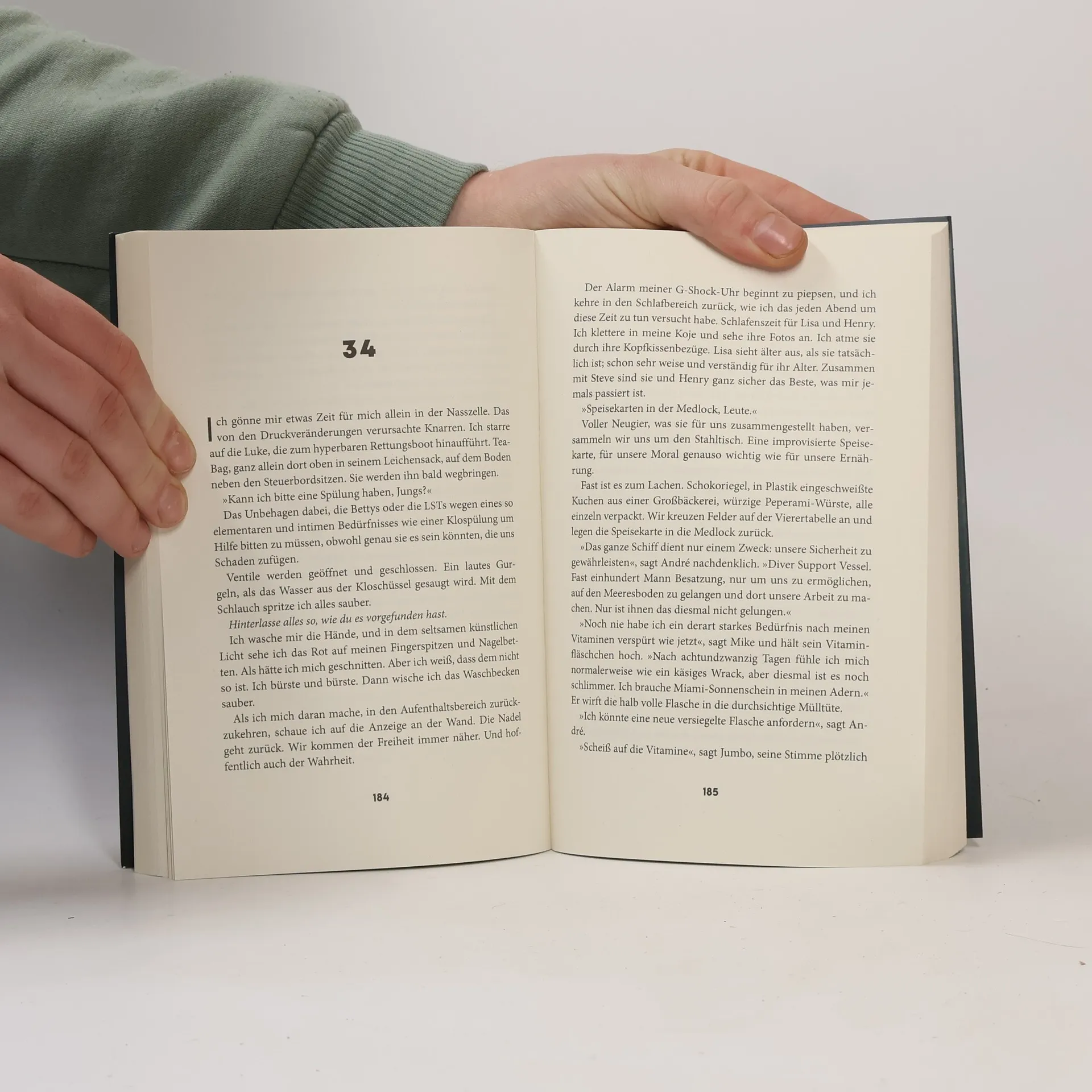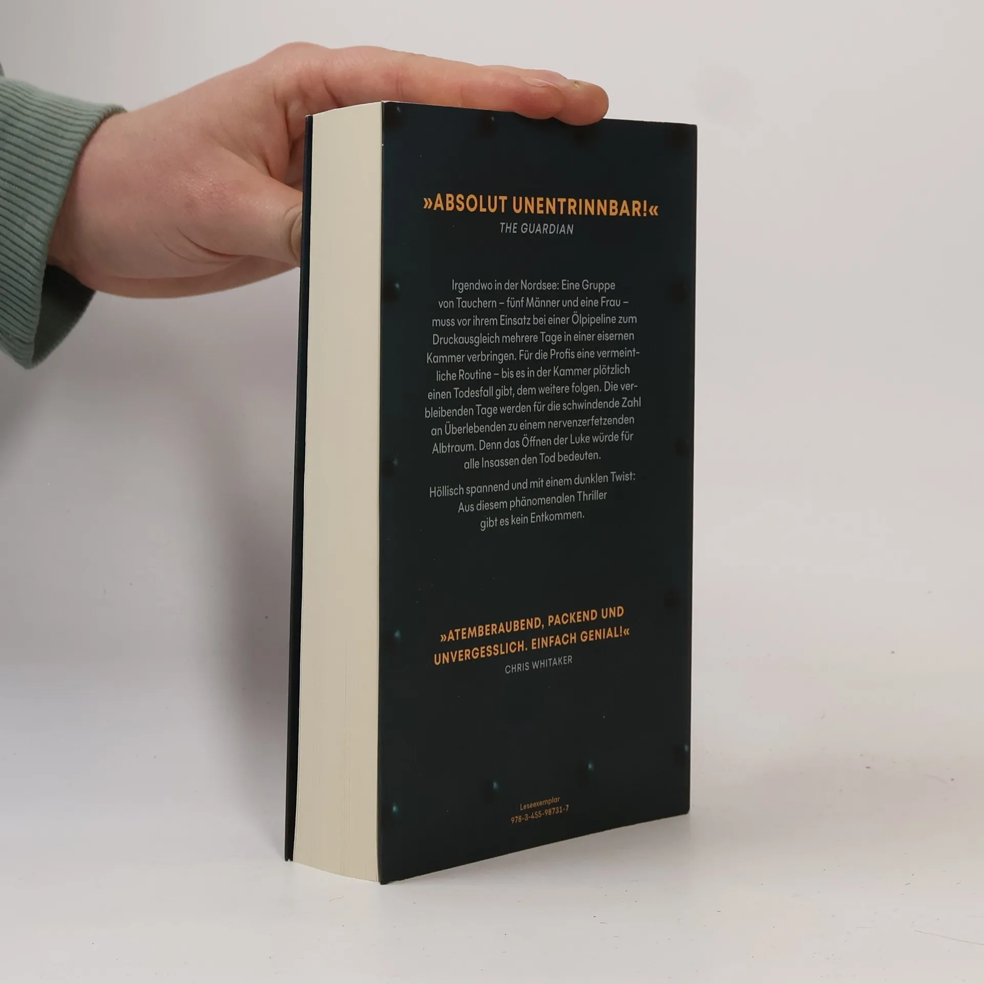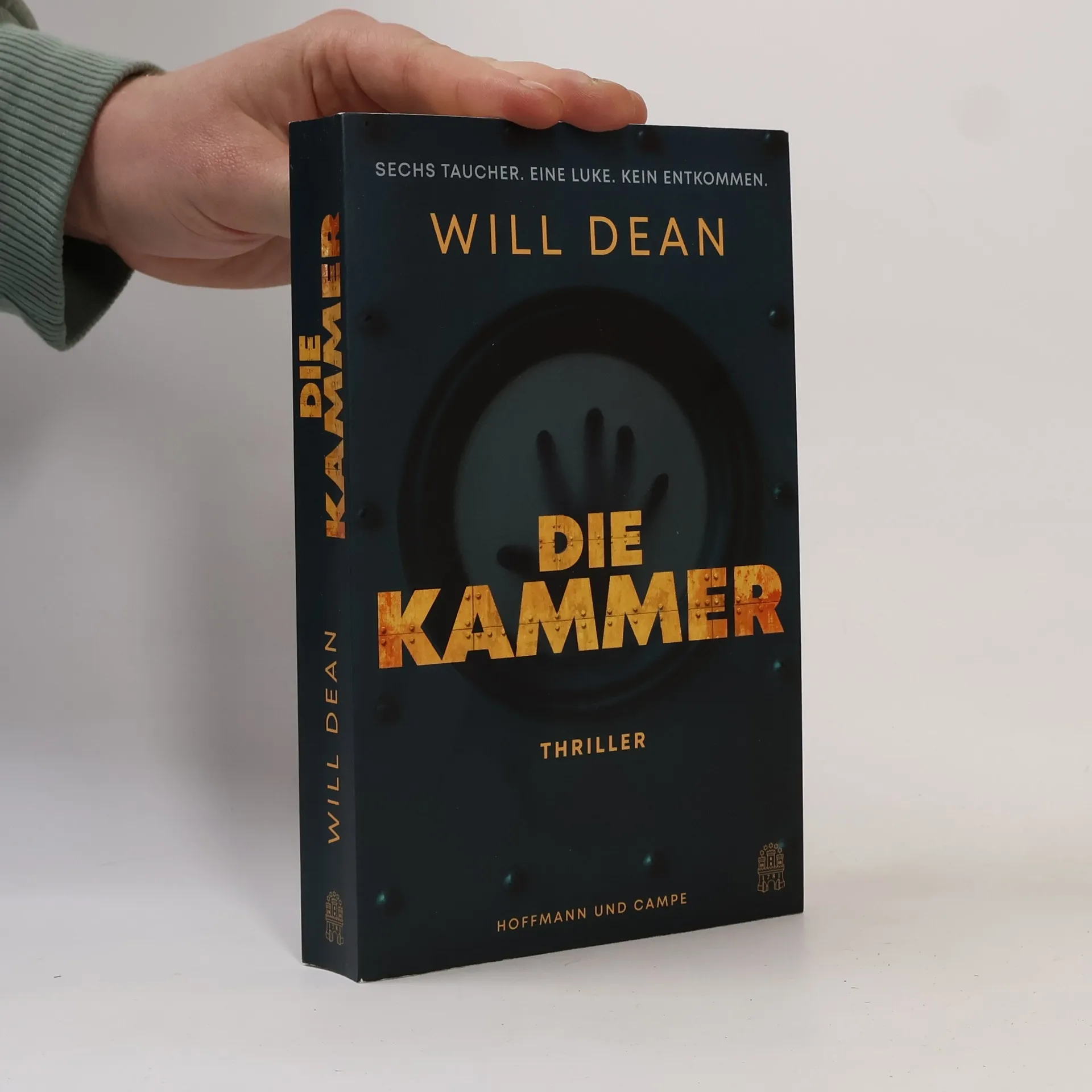 Sechs Taucher. Eine Luke. Kein Entkommen. Irgendwo in der Nordsee: Eine Gruppe von Tauchern – fünf Männer und eine Frau –, müssen vor ihrem Einsatz bei einer Ölpipeline zum Druckausgleich mehrere Tage in einer eisernen Kammer verbringen. Für die Profis eine vermeintliche Routine – bis es in der Kammer plötzlich einen ersten Todesfall gibt, dem weitere folgen. Die verbleibenden Tage werden für die weiter schwindende Zahl an Überlebenden zu einem nervenzerfetzenden Albtraum, aus dem es kein Entkommen gibt. Denn das Öffnen der Tür würde für alle Insassen den Tod bedeuten. Höllisch spannend und mit einem dunklen Twist: Dieser phänomenale Thriller ist ebenso unvorhersehbar wie unentrinnbar. » Ein wirklicher Pageturner und allen Lesern von Thrillern zu empfehlen. « Hans-Jürgen Strickling, Tiefseetaucher » Schon ohne Mord ist der von Dean beschriebene Tiefseetauchgang ungeheuer spannend. « Max Landorff, Die Zeit