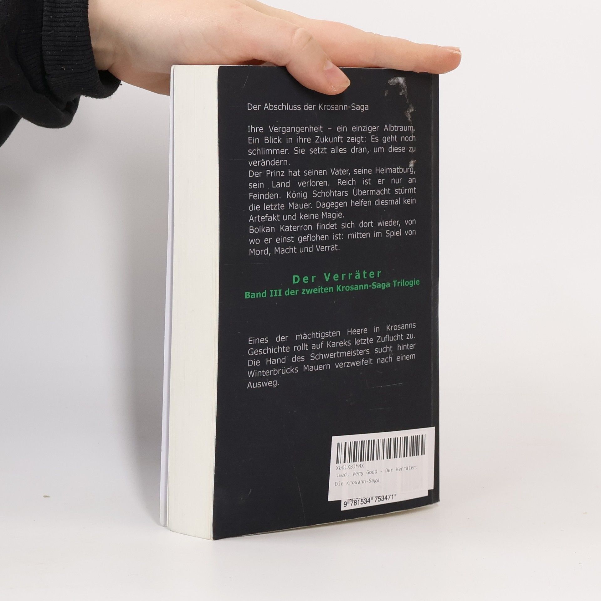 Der Abschluss der Krosann-SagaIhre Vergangenheit – ein einziger Albtraum. Ein Blick in ihre Zukunft Es geht noch schlimmer. Sie setzt alles dran, um diese zu verändern.Der Prinz hat seinen Vater, seine Heimatburg, sein Land verloren. Reich ist er nur an Feinden. König Schohtars Übermacht stürmt die letzte Mauer. Dagegen helfen diesmal kein Artefakt und keine Magie.Bolkan Katerron findet sich dort wieder, von wo er einst geflohen mitten im Spiel von Mord, Macht und Verrat.Der Verräter – Band III der zweiten Krosann-Saga TrilogieEines der mächtigsten Heere in Krosanns Geschichte rollt auf Kareks letzte Zuflucht zu. Die Hand des Schwertmeisters sucht hinter Winterbrücks Mauern verzweifelt nach einem Ausweg.Überblick aller Krosann-Bände Die Krosann-Saga (Erste Trilogie "Lehrjahre")Band 1: Die AuftragsmörderinBand 2: Der SchwertmeisterBand 3: Die SanduhrDie Krosann-Saga (Zweite Trilogie "Königsweg")Band 1: Die MyrnengöttinBand 2: Der SeelenspeerBand 3: Der VerräterDüEchtzeiT - Leid kennt keinen SonntagEchtzeiT - Wer die Wahrheit quältEchtzeit - Gier frisst jede Tugend (Herbst 2016)