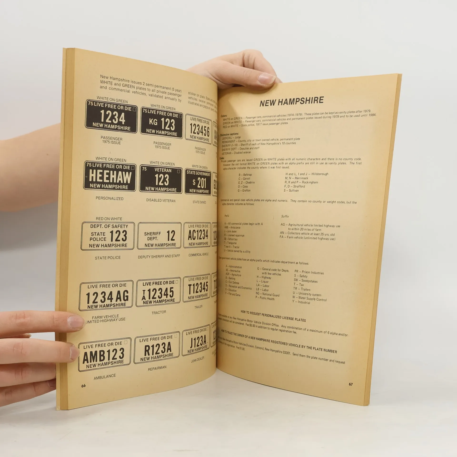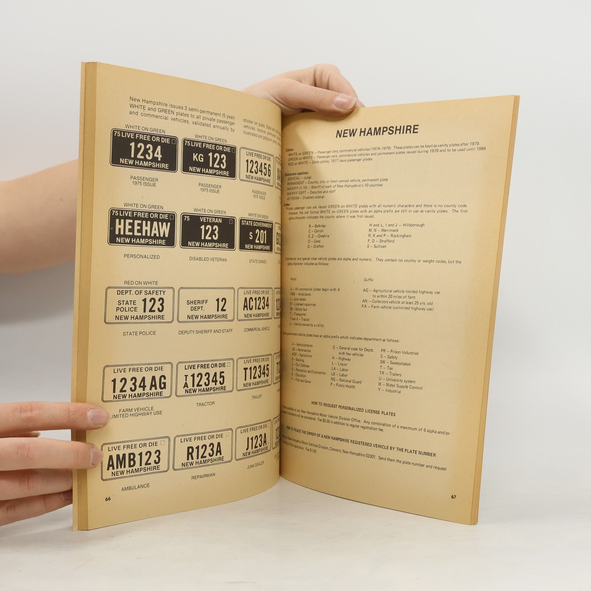 A catalog of automobile license plates currently in use, arranged by state, and giving illustrated examples of passenger car plates as well as all special-category plates with descriptive notes on interpretation of colors and codes