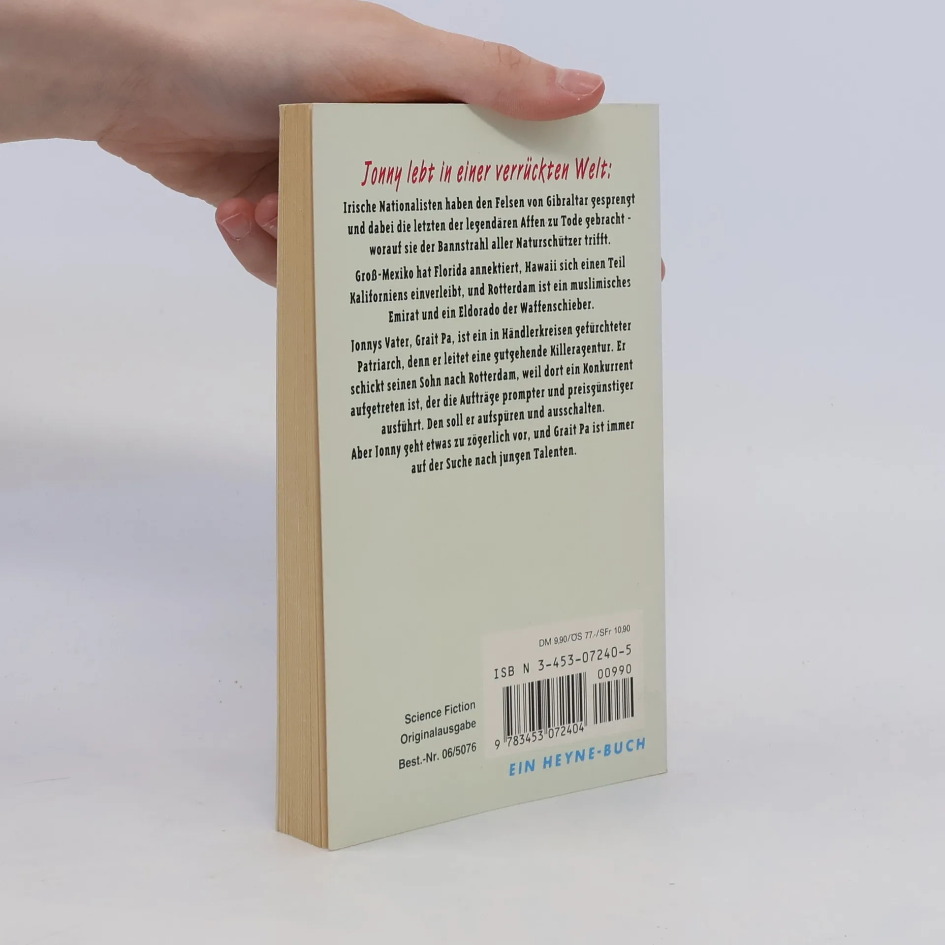 Jonny lebt in einer verrückten Welt:============================Irische Nationalisten haben den Felsen von Gibraltar gesprengt und dabei die letzten der legendären Affen zu Tode gebracht - worauf sie der Bannstrahl aller Naturschützer trifft.Groß-Mexiko hat Florida annektiert, Hawaii sich einen Teil Kaliforniens einverleibt, und Rotterdam ist ein muslimisches Emirat und ein Eldorado der Waffenschieber.Jonnys Vater, Grait Pa, ist ein in Händlerkreisen gefürchteter Patriarch, denn er leitet eine gutehende Killeragentur. Er schickt seinen Sohn nach Rotterdam, weil dort ein Konkurrent auf getreten ist, der die Aufträge prompter und preisgünstiger ausführt. Den soll er aufspüren und ausschalten.Aber Jonny geht etwas zu zögerlich vor, und Grait Pa ist immer auf der Suche nach jungen Talenten.