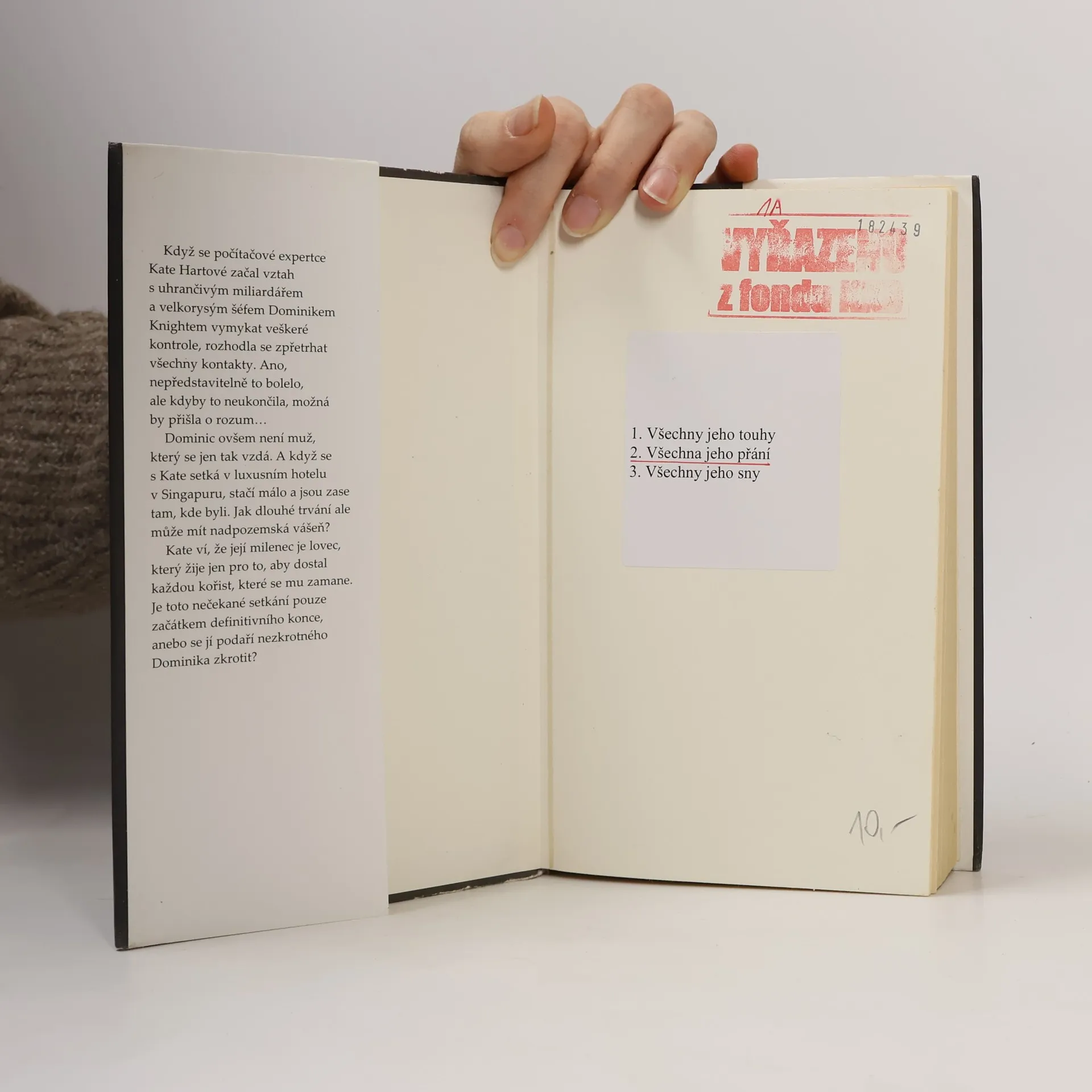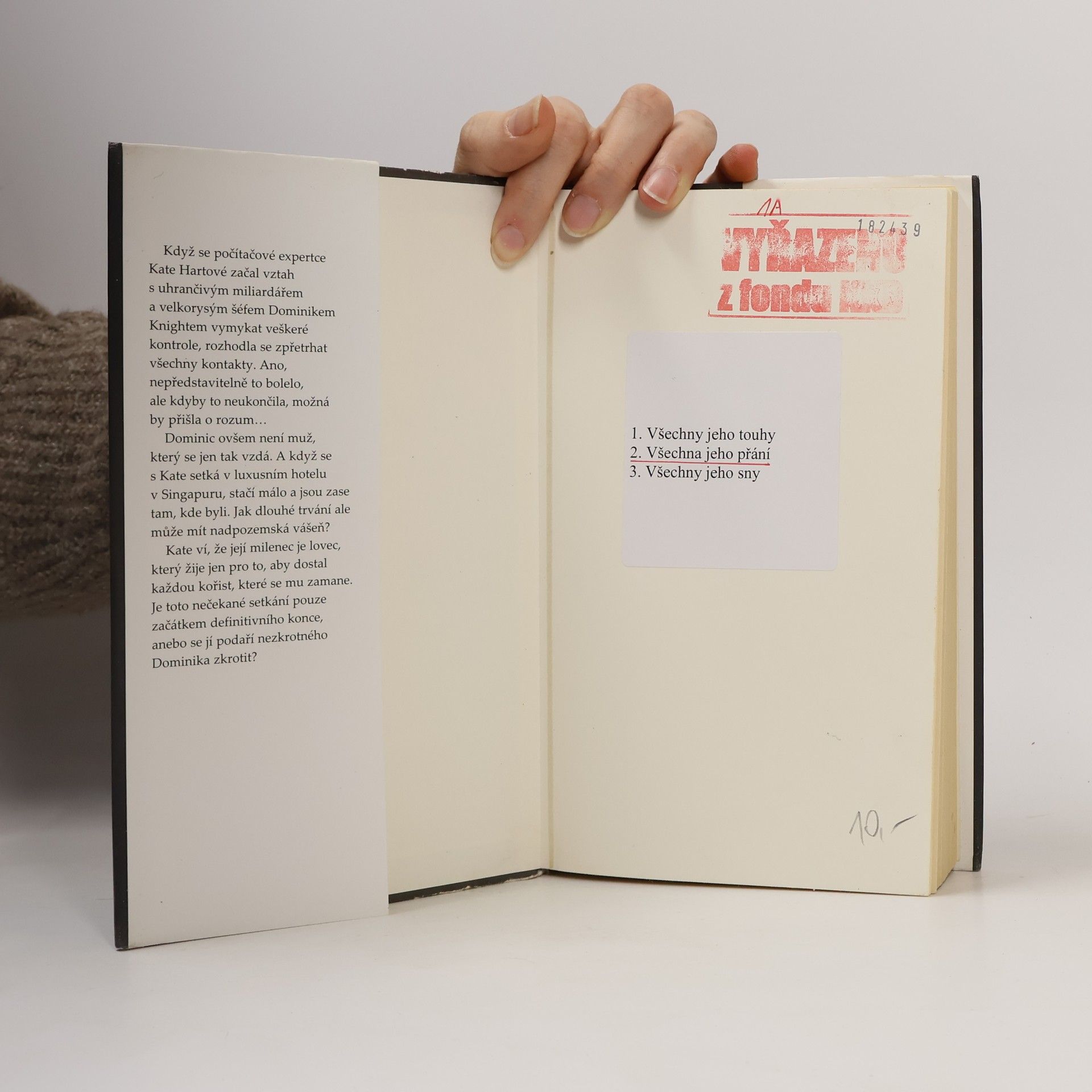 Neodolatelná přitažlivost, nebo nebezpečná posedlost? Když se začal Katin vztah s uhrančivým miliardářem Dominikem Knightem vymykat veškeré kontrole, rozhodla se přetrhat všechny vztahy. Ano, nepředstavitelně to bolelo, ale kdyby to neukončila, možná by přišla o rozum... Dominic ovšem není muž, který se jen tak vzdá. A když se s Kate setká v luxusním hotelu v Singapuru, stačí málo a jsou zase tam, kde byli. Jak dlouhé trvání ale může mít nadpozemská vášeň? Kate ví, že její milenec je lovec, který žije jen pro to, aby dostal každou kořist, které se mu zamane. Je toto nečekané setkání pouze začátkem definitivního konce, anebo se jí podaří nezkrotného Dominika zkrotit?