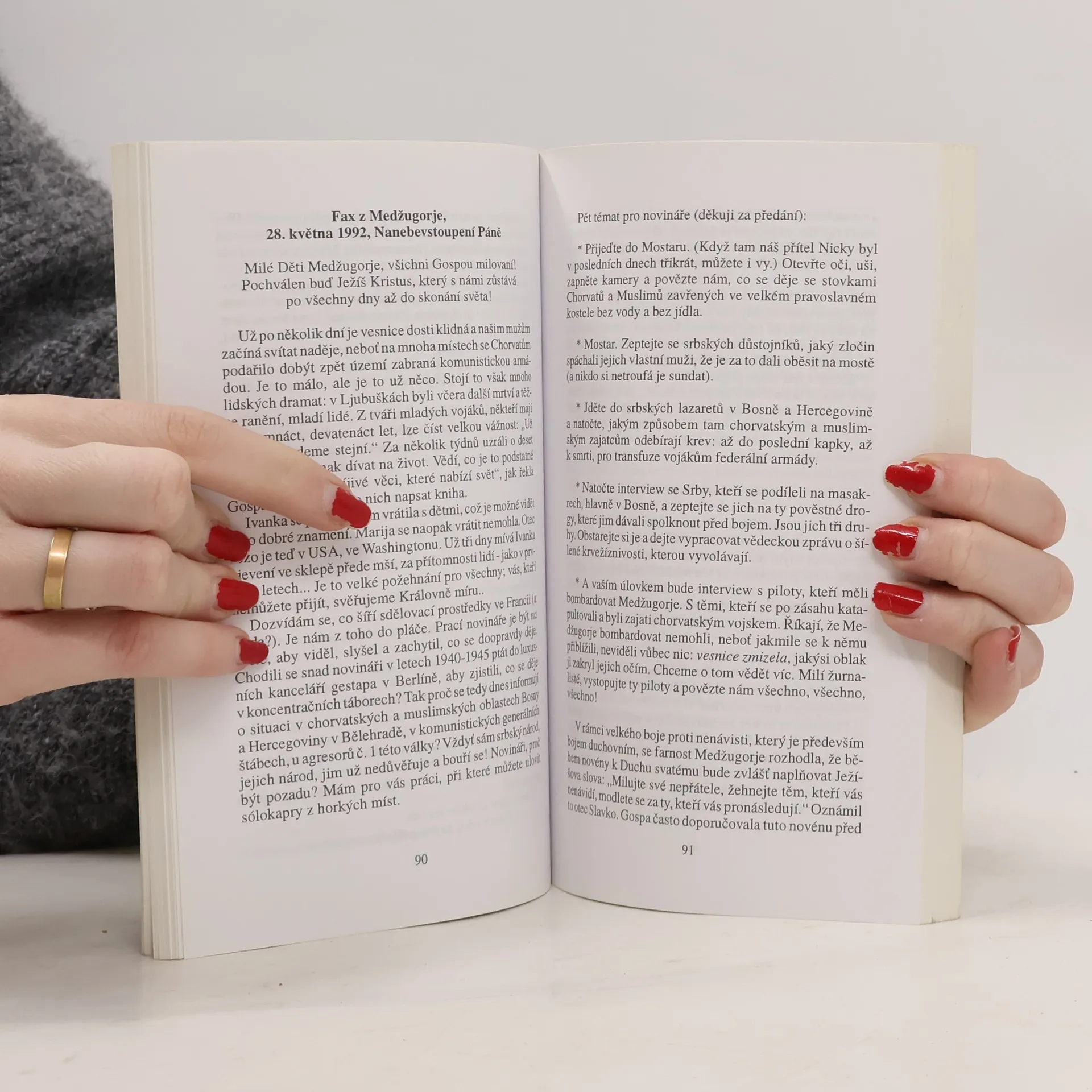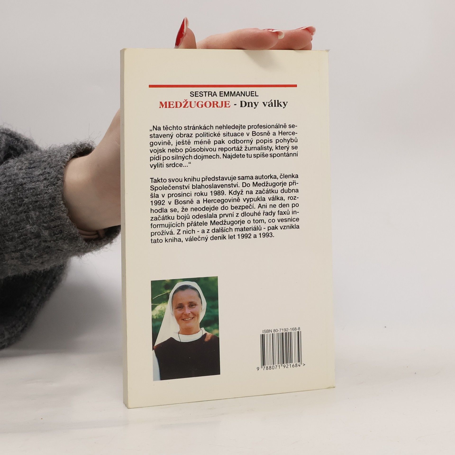 „Na těchto stránkách nehledejte profesionálně sestavený obraz politické situace v Bosně a Hercegovině, ještě méně pak odborný popis pohybů vojsk nebo působivou reportáž žurnalisty, který se pídí po silných dojmech. Najdete tu spíše spontánní vylití srdce...“ Takto svou knihu představuje sama autorka, členka Společenství blahoslavenství. Do Medžugorje přišla v prosinci roku 1989. Když na začátku dubna 1992 v Bosně a Hercegovině vypukla válka, rozhodla se, že neodejde do bezpečí. Ani ne den po začátku bojů odeslala první z dlouhé řady faxů informujících přátele Medžugorje o tom, co vesnice prožívá. Z nich – a z dalších materiálů – pak vznikla tato kniha, válečný deník let 1992 a 1993.
