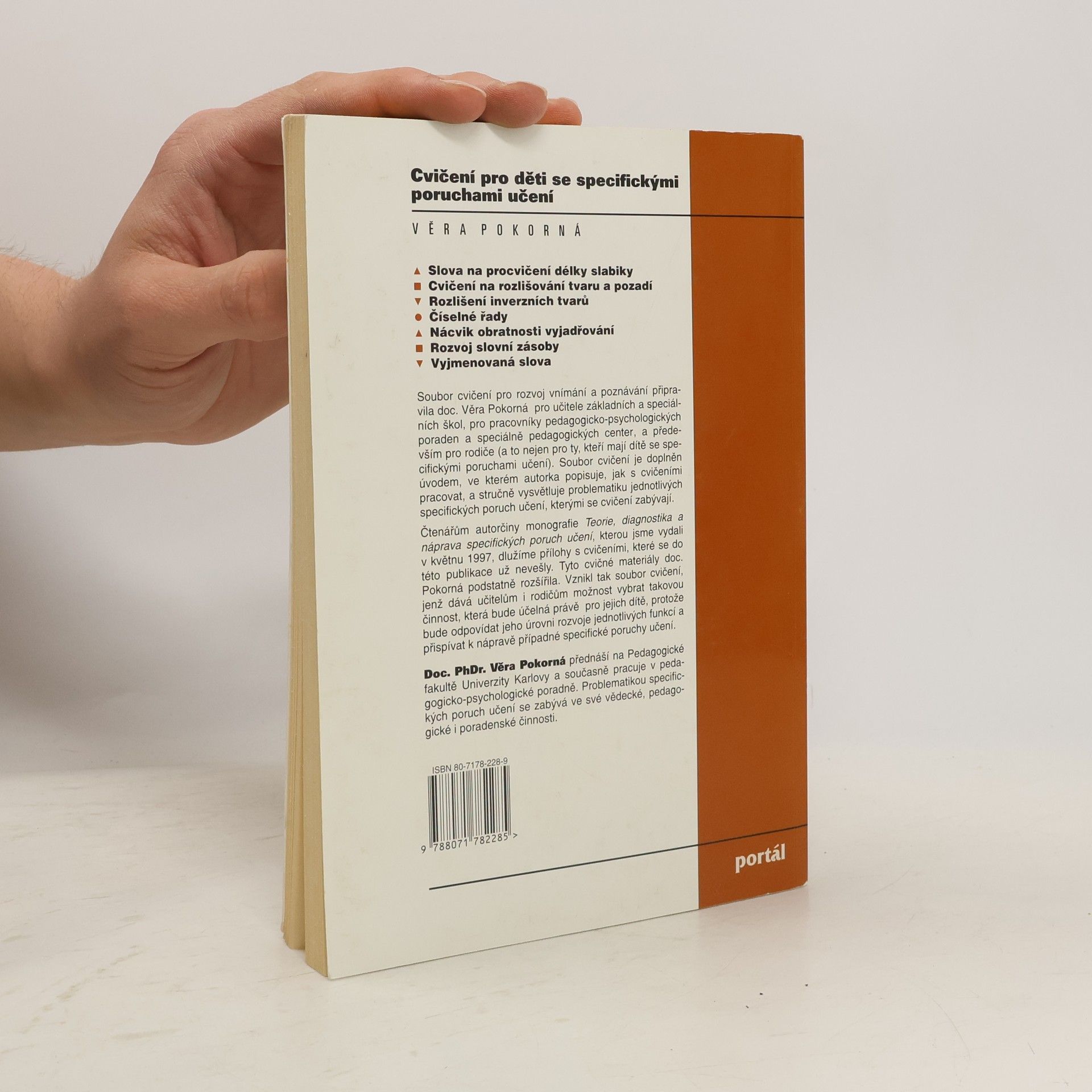 Soubor cvičení pro rozvoj vnímání a poznávání, který učitelům i rodičům umožňuje vybrat takovou činnost, která je pro dítě účelná, protože odpovídá jeho úrovni rozvoje jednotlivých funkcí a přispívá k nápravě příslušné specifické poruchy učení. V úvodu autorka popisuje, jak s cvičeními pracovat, a stručně vysvětluje problematiku jednotlivých specifických poruch učení, kterými se cvičení zabývají. Kniha navazuje na publikaci Teorie, diagnostika a náprava specifických poruch učení.