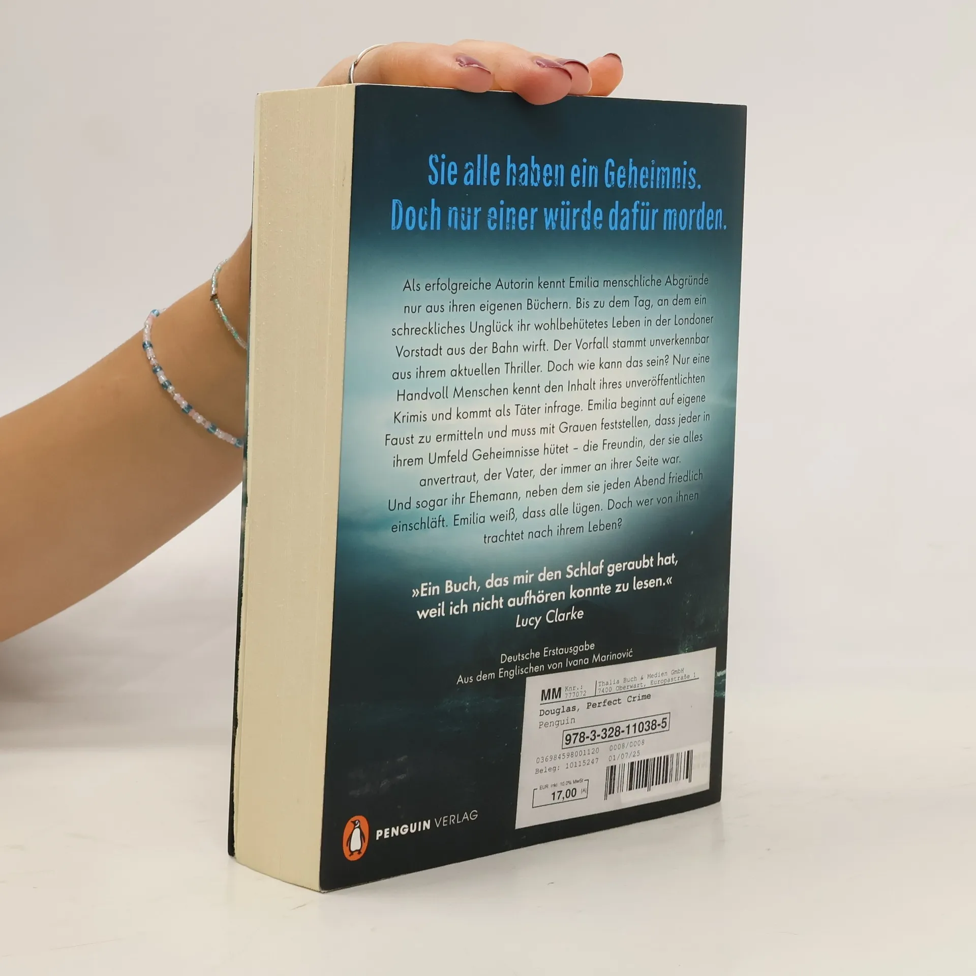 Sie alle haben ein Geheimnis. Doch nur einer würde dafür morden. Als erfolgreiche Autorin kennt Emilia menschliche Abgründe nur aus ihren eigenen Büchern. Bis zu dem Tag, an dem ein schreckliches Unglück ihr wohlbehütetes Leben in der Londoner Vorstadt aus der Bahn wirft. Der Vorfall stammt unverkennbar aus ihrem aktuellen Thriller. Doch wie kann das sein? Nur eine Handvoll Menschen kennt den Inhalt ihres unveröffentlichten Krimis und kommt als Täter infrage. Emilia beginnt auf eigene Faust zu ermitteln und muss mit Grauen feststellen, dass jeder in ihrem Umfeld Geheimnisse hütet – die Freundin, der sie alles anvertraut, der Vater, der immer an ihrer Seite war. Und sogar ihr Ehemann, neben dem sie jeden Abend friedlich einschläft. Emilia weiß, dass alle lügen. Doch wer von ihnen trachtet nach ihrem Leben? Englands Thriller-Königin Claire Douglas ist zurück. Nach den Nummer-1-SPIEGEL-Bestsellern Beste Freundin und Girls Night nun ihr neuestes Meisterwerk. Unfassbar atmosphärisch, unvergleichlich spannend – unerwartete Wendungen und Twists bis zur allerletzten Seite.