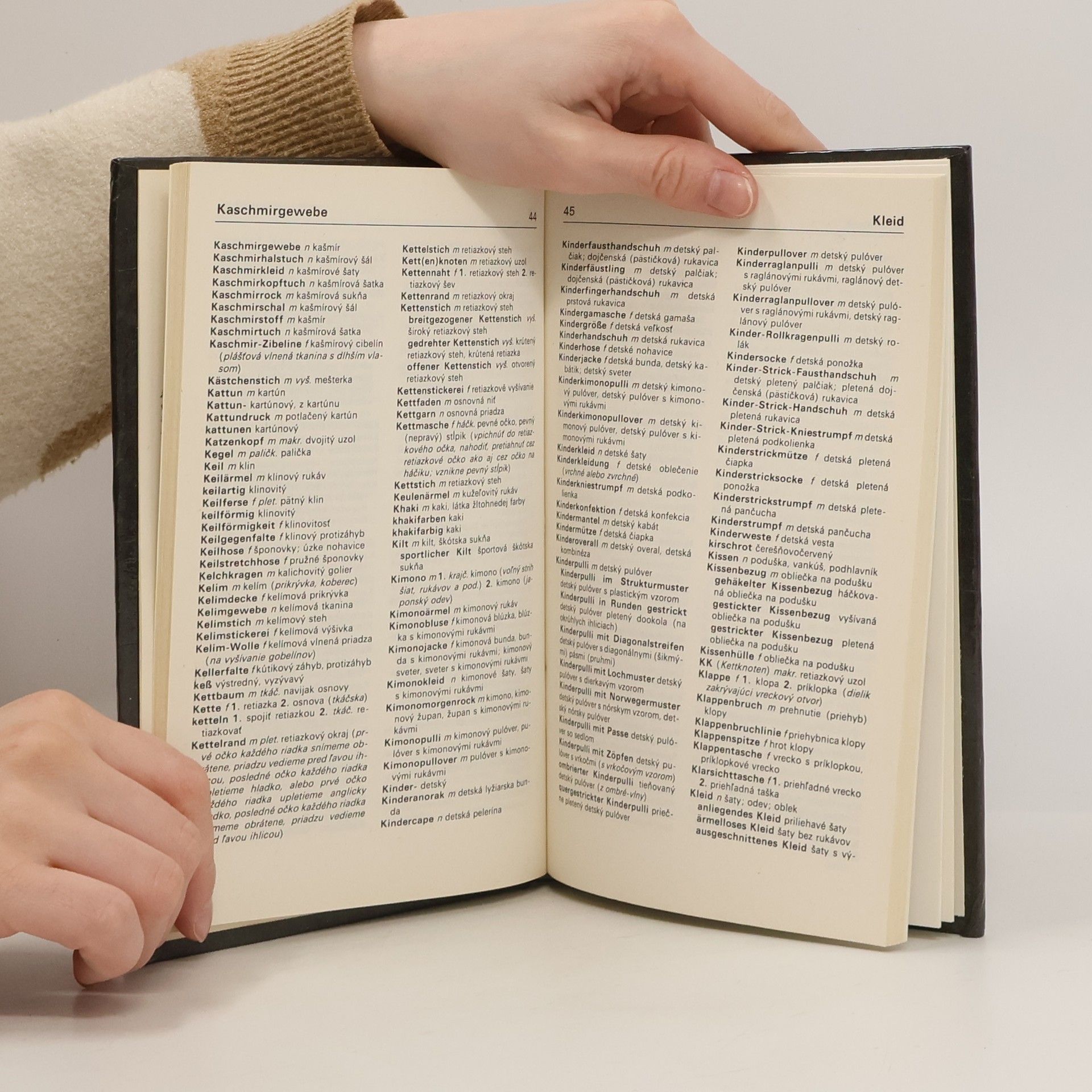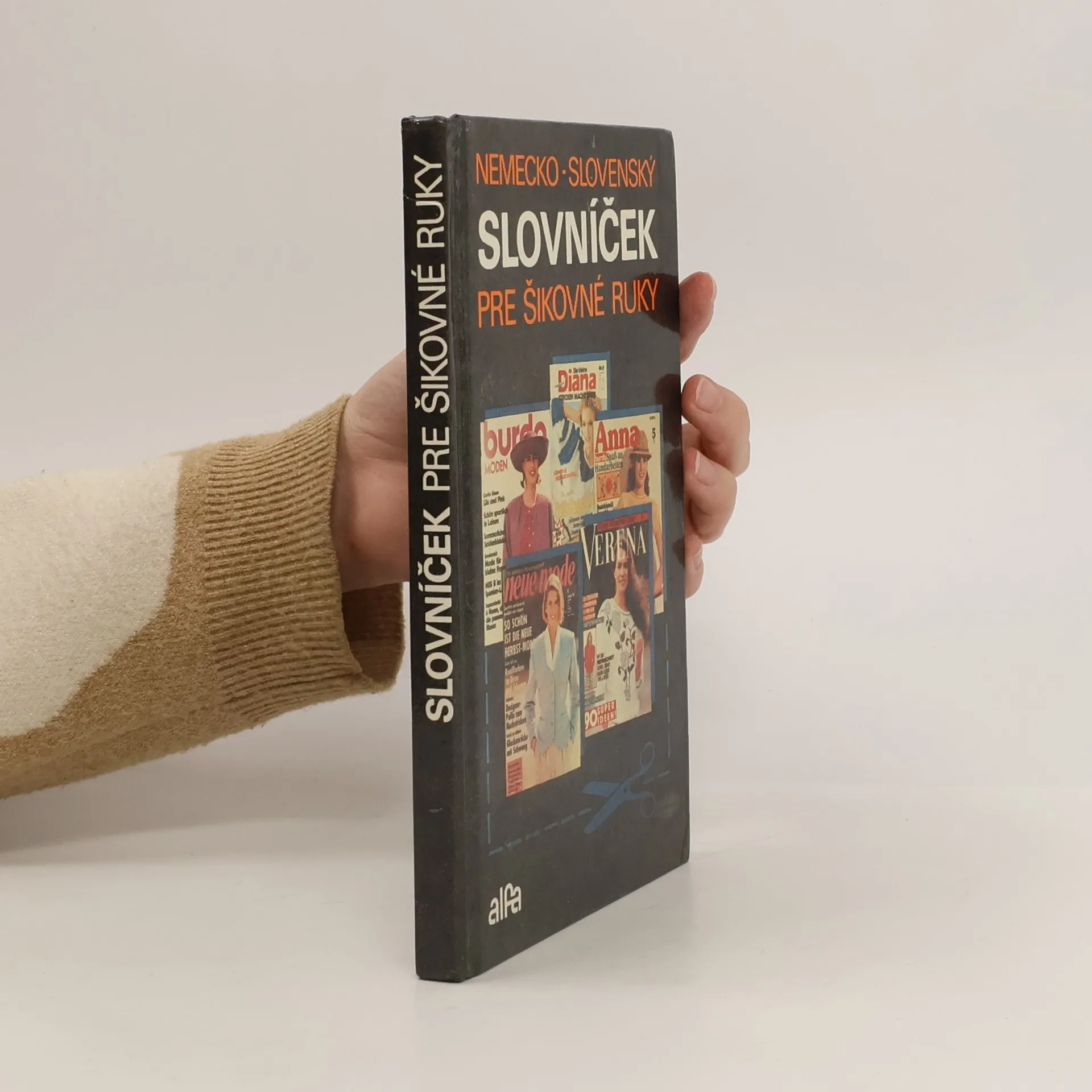 Praktický slovník pro ženy. Obsahuje cca 5000 termínov používaných pri ručných prácach-zhotovovanie strihov, názvy techník pletenia, háčkovania a vyšívania, názvy očiek, stĺpikov, stehov, pletiarskych a háčkovacích úkonov, názvy základných paličkovacích väzieb, základné termíny frivolitkovania, viazania uzlov, tkania, šitej čipky, sieťovania a krosienkovania, názvy odevov, odevných doplnkov, detailov odevov a pozamentérie. Uvádza tiež názvy materiálov /na odevy, pletenie, háčkovanie/ a názvy farieb a rôznych desénov. Prvé vydanie. Cena knihy v čase vydania: 15.- Kčs.