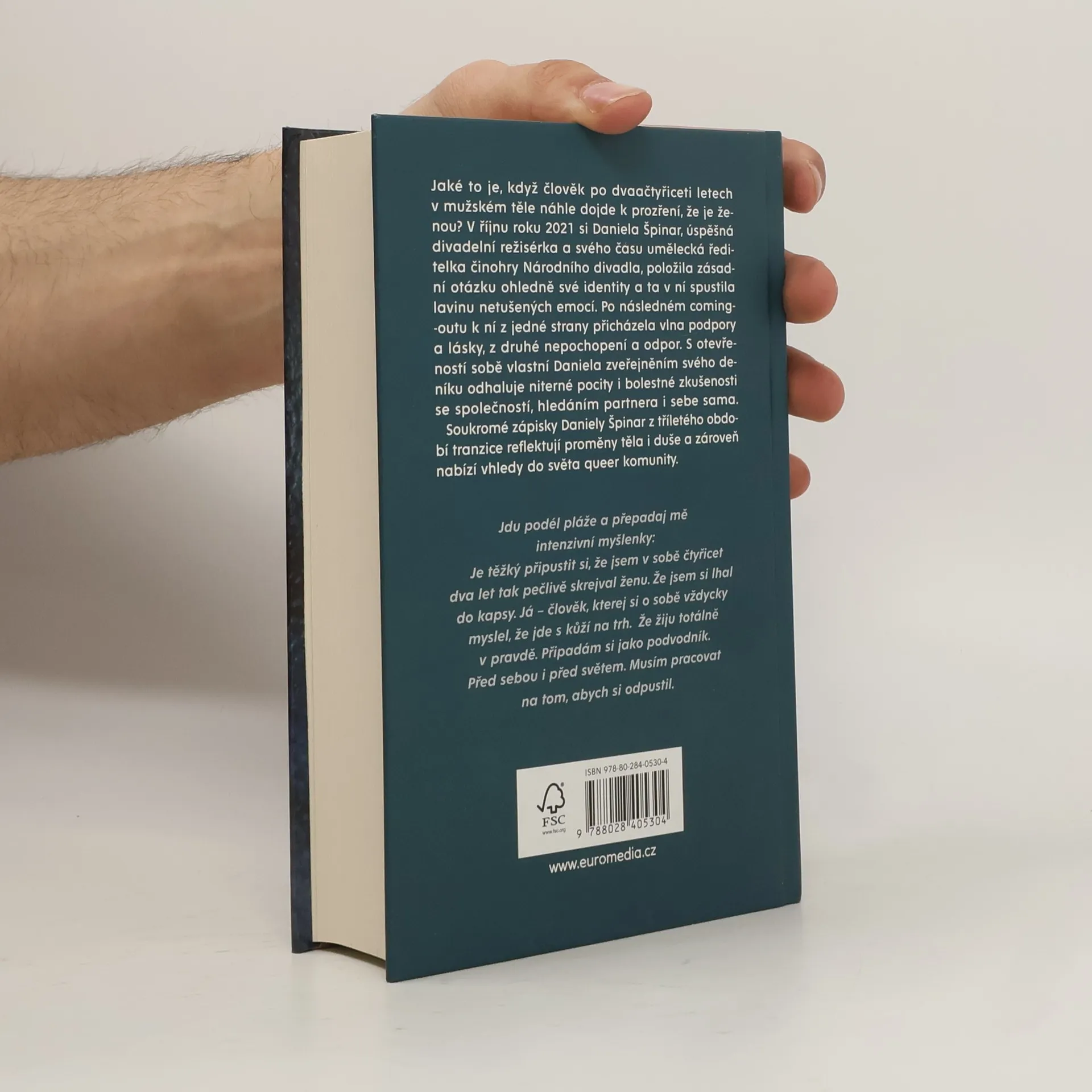 Jaké to je, když člověk po dvaačtyřiceti letech v mužském těle náhle dojde k prozření, že je ženou? V říjnu roku 2021 si Daniela Špinar, úspěšná divadelní režisérka a svého času umělecká ředitelka činohry Národního divadla, položila zásadní otázku ohledně své identity a ta v ní spustila lavinu netušených emocí. Po následném coming-outu k ní z jedné strany přicházela vlna podpory a lásky, z druhé nepochopení a odpor. S otevřeností sobě vlastní Daniela zveřejněním svého deníku odhaluje niterné pocity i bolestné zkušenosti se společností, hledáním partnera i sebe sama. Soukromé zápisky Daniely Špinar ze tříletého období tranzice reflektují proměny těla i duše a zároveň nabízí vhledy do světa queer komunity.