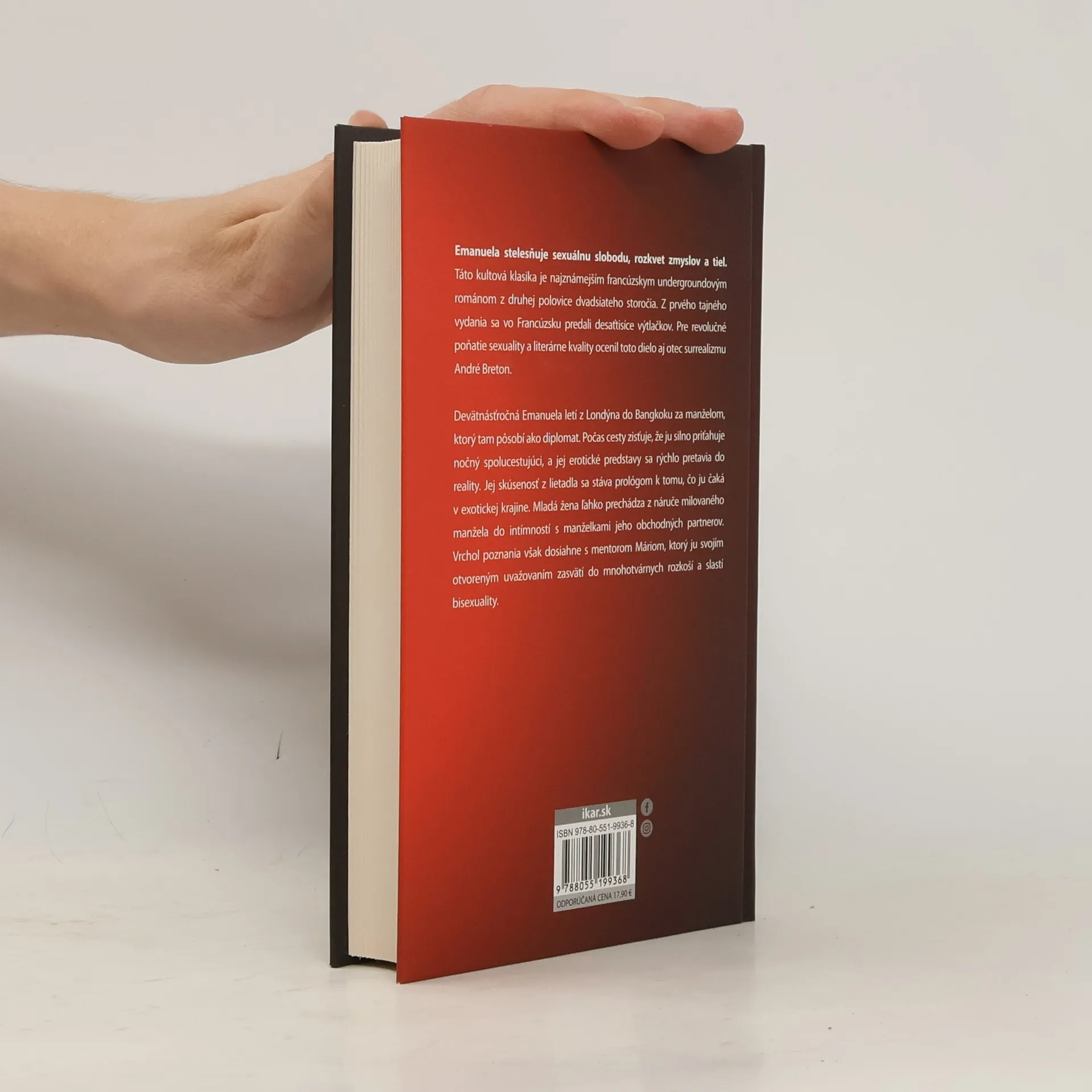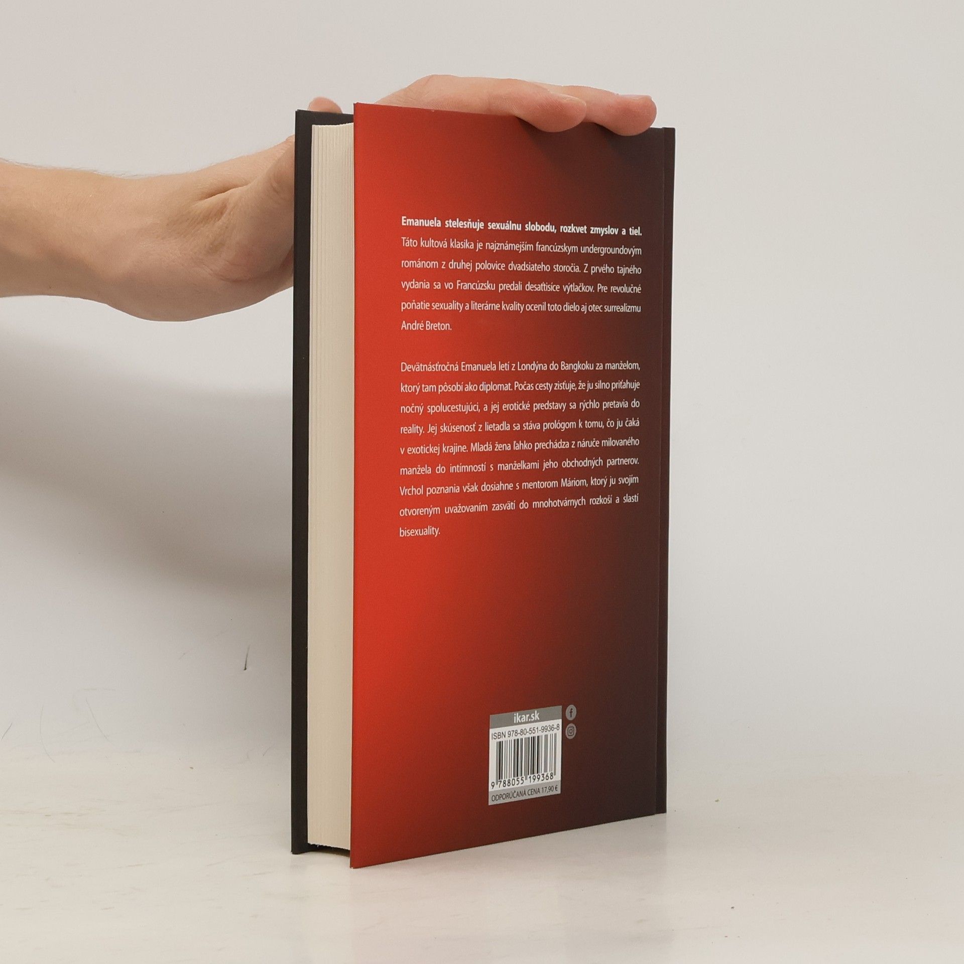 Erotika je cestou k ľudskému šťastiu Emanuela stelesňuje sexuálnu slobodu, rozkvet zmyslov a tiel. Táto kultová klasika je najznámejším francúzskym undergroundovým románom z druhej polovice dvadsiateho storočia. Z prvého tajného vydania sa vo Francúzku predali desaťtisíce výtlačkov. Pre svoje revolučné poňatie sexuality a literárne kvality ocenil toto dielo aj otec surrealizmu André Breton. Devätnásťročná Emanuela letí z Londýna do Bangkoku za manželom, ktorý tam pôsobí ako diplomat. Počas cesty zisťuje, že ju silno priťahuje nočný spolucestujúci a jej erotické predstavy sa rýchlo pretavia do reality. Jej skúsenosť z lietadla sa stáva prológom k tomu, čo ju čaká v exotickej krajine. Mladá žena ľahko prechádza z čakajúcej náruče milovaného manžela do intímností s manželkami jeho obchodných partnerov. Vrchol poznania však dosiahne s mentorom Máriom, ktorý ju svojím otvoreným uvažovaním zasvätí do mnohotvárnych rozkoší a slastí bisexuality.