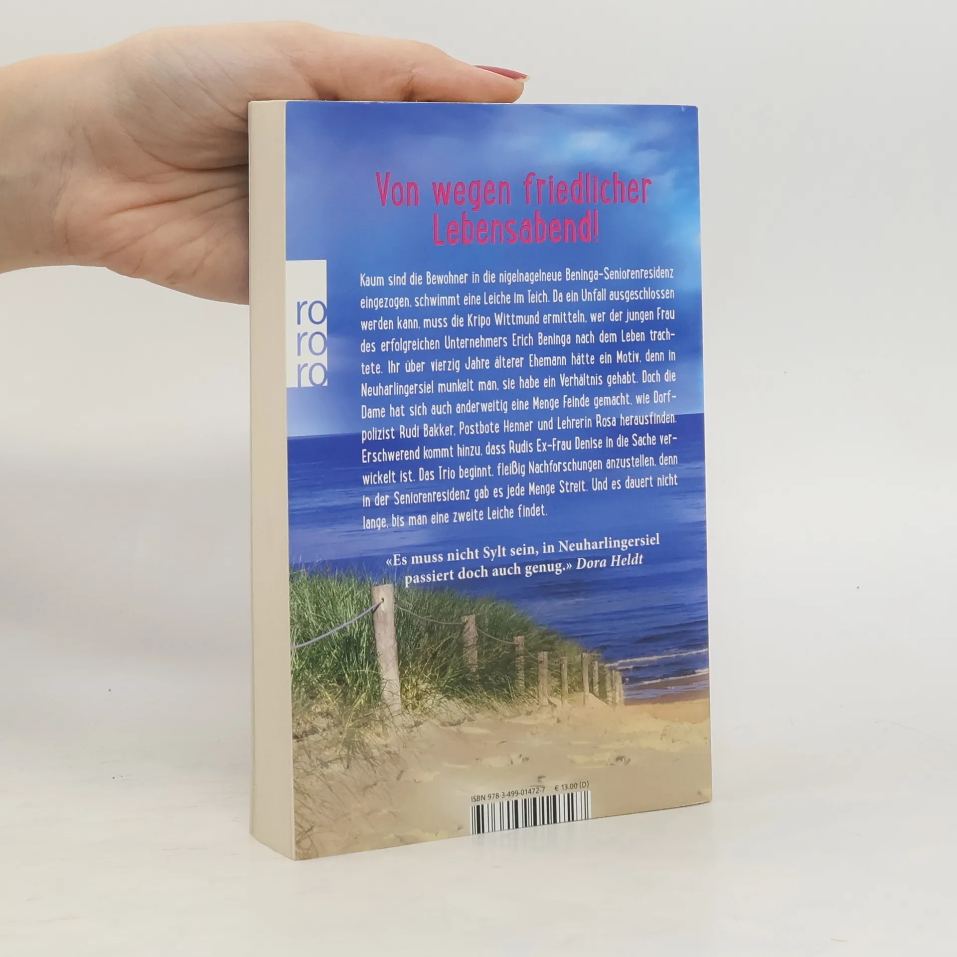 Von wegen friedlicher Lebensabend! Kaum sind die Bewohner in die nigelnagelneue Beninga-Seniorenresidenz eingezogen, schwimmt eine Leiche im Teich. Da ein Unfall ausgeschlossen werden kann, muss die Kripo Wittmund ermitteln, wer der jungen Frau des erfolgreichen Unternehmers Erich Beninga nach dem Leben trachtete. Ihr über vierzig Jahre älterer Ehemann hätte ein Motiv, denn in Neuharlingersiel munkelt man, sie habe ein Verhältnis gehabt. Doch die Dame hat sich auch anderweitig eine Menge Feinde gemacht, wie Dorfpolizist Rudi Bakker, Postbote Henner und Lehrerin Rosa herausfinden. Erschwerend kommt hinzu, dass Rudis Ex-Frau Denise in die Sache verwickelt ist. Das Trio beginnt, fleißig Nachforschungen anzustellen, denn in der Seniorenresidenz gab es jede Menge Streit. Und es dauert nicht lange, bis man eine zweite Leiche findet. «Es muss nicht Sylt sein, in Neuharlingersiel passiert doch auch genug.» Dora Heldt