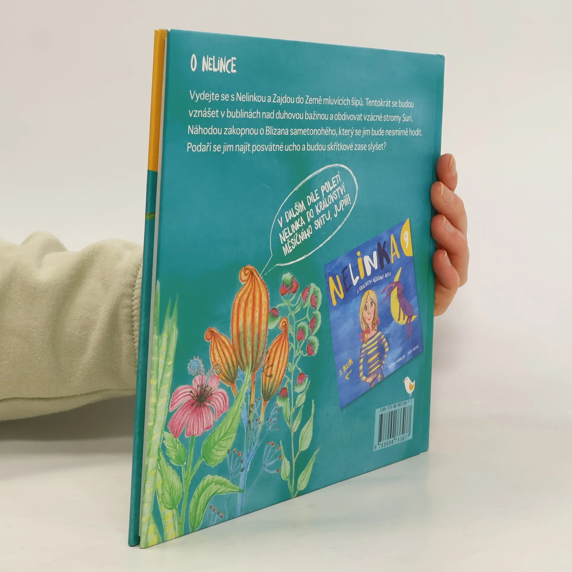Další pokračování dobrodružných příběhů Nelinky a Zajdy. Tentokrát se vypraví pro čtvrtý posvátný symbol do Země mluvících šípů. Vydejte se s Nelinkou a Zajdou do Země mluvících šípů, kde se oba budou vznášet v bublinách nad duhovou bažinou a obdivovat vzácné stromy Suri. Náhodou zakopnou o Blizana sametonohého, který se jim bude nesmírně hodit. Podaří se jim najít posvátné ucho a budou skřítkové zase slyšet? Nakladatelská anotace.