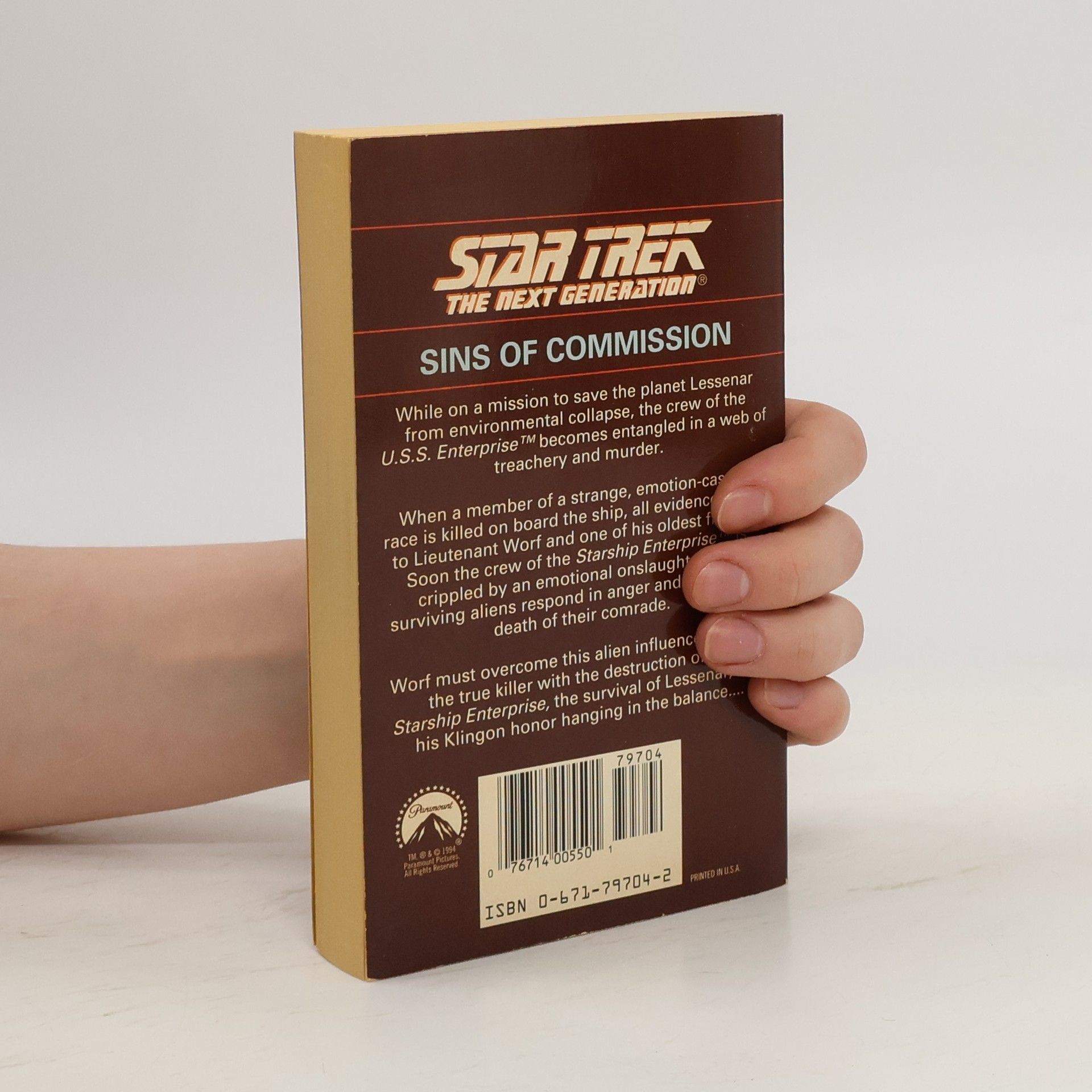 While on a mission to save the planet Lessenar from environmental collapse, the crew of the U.S.S. Enterprise becomes entangled in a web of treachery and murder. When a member of a strange, emotion-casting race is killed on board the ship, all evidence points to Lieutenant Worf and one of his oldest friends. Soon the crew of the Starship Enterprise is crippled by an emotional onslaught as the surviving aliens respond in anger and pain to the death of their comrade. Worf must overcome this alien influence and find the true killer with the destruction of the Starship Enterprise, the survival of Lessenar, and his Klingon honor hanging in the balance.