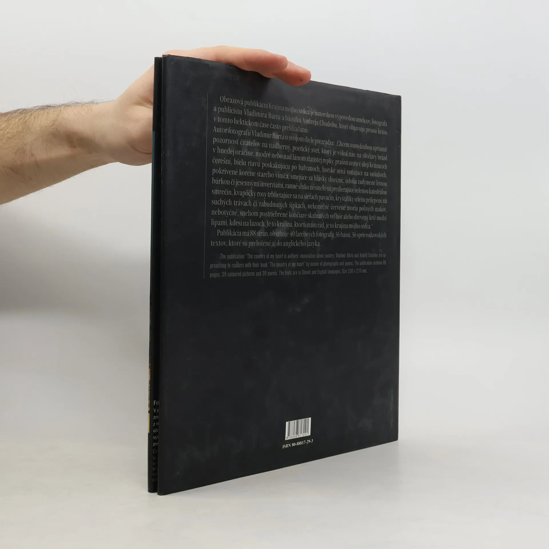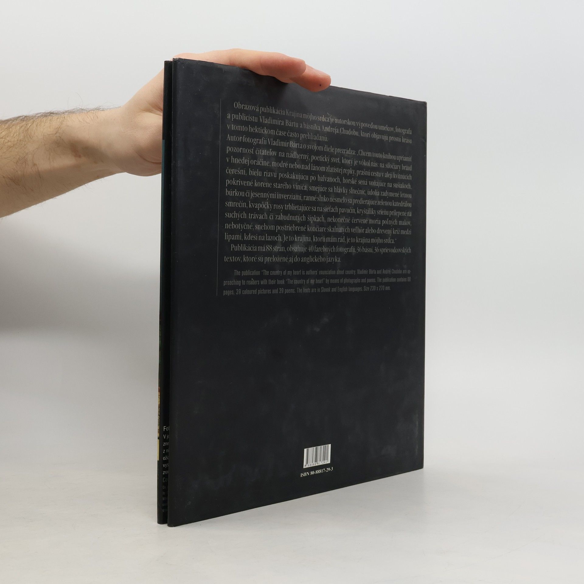 Nevšedné umelecké pohľady renomovaného fotografa na slovenskú krajinu, jej štruktúru, tvarovú rôznorodosť i pestrosť farieb. Nádherné farebné fotografie, melancholických južných rovín, malebne zvlneného podhoria i nebotyčných horských končiarov. Majestátnosť panorám, ale aj čaro detailu, krajinu človekom nenarušenú, ale aj krajinu, ktorú modelovali pluhom mnohé generácie našich predchodcov, to všetko obsahuje táto prekrásna kniha. Texty v slovenčine a angličtine.