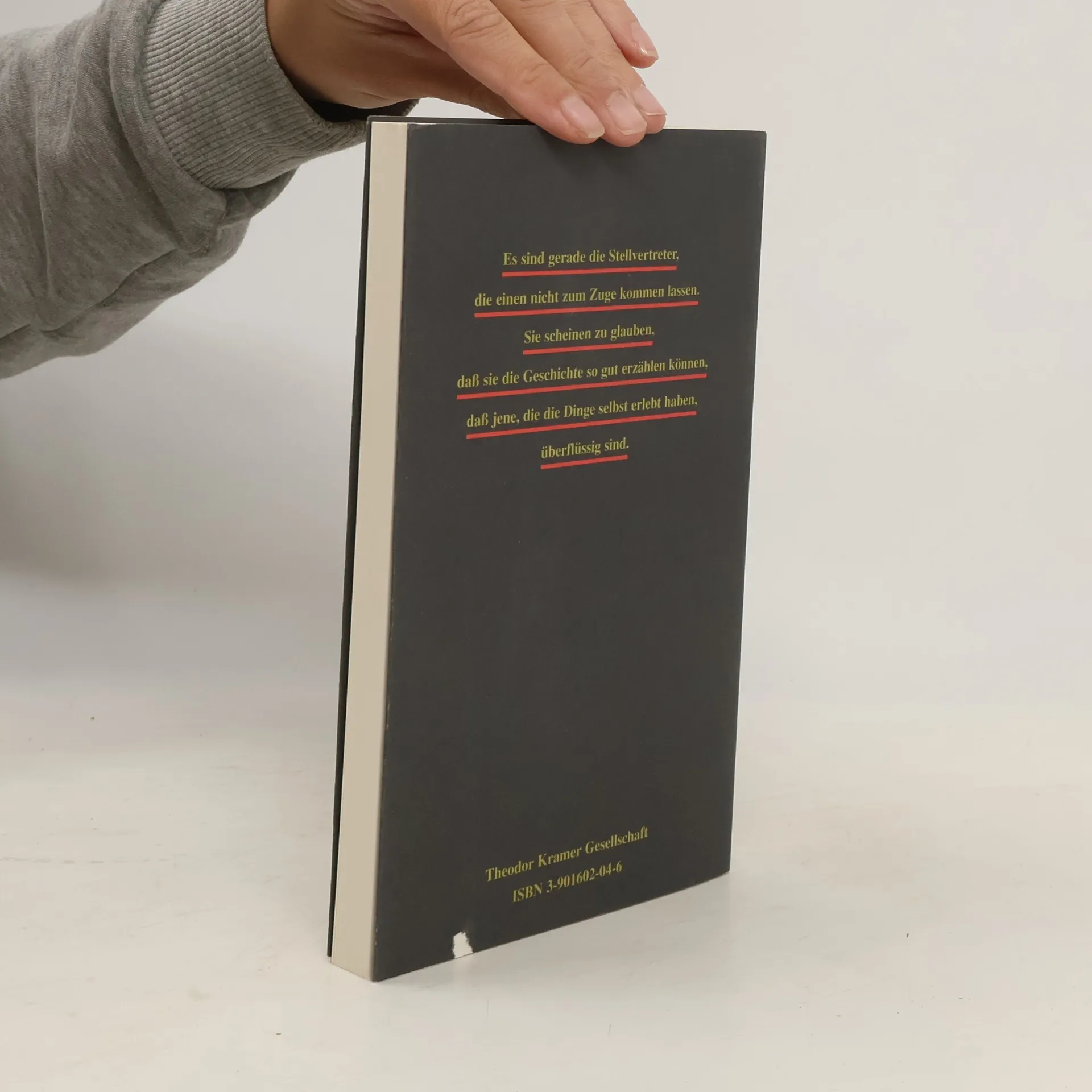 "Es sind gerade die Stellvertreter, die einen nicht zum Zuge kommen lassen. Sie scheinen zu glauben, daß sie die Geschichte so gut erzählen können, daß jene, die die Dinge selbst erlebt haben, überflüssig sind"--Back cover of jacket.