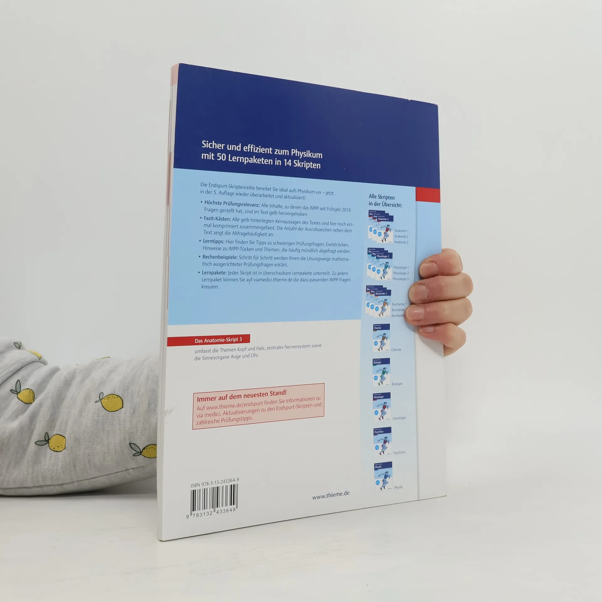 Endspurt VorklinikSicher und effizient zum Physikum mit 50 Lernpaketen in 14 SkriptenDie Endspurt-Skriptenreihe bereitet Dich ideal aufs Physikum vor - jetzt in der 3. Auflage wieder überarbeitet und aktualisiert!- Höchste Prü Alle Inhalte, zu denen das IMPP seit Frühjahr 2008 Fragen gestellt hat, sind im Text gelb hervorgehoben.- Fazit-Kä Alle gelb hinterlegten Kernaussagen des Textes sind hier noch einmal komprimiert zusammengefasst. Die Anzahl der Ausrufezeichen neben dem Text zeigt die Abfragehäufigkeit an.- Hier findest Du Tipps zu schwierigen Prüfungsfragen, Eselsbrücken, Hinweise zu IMPP-Tücken und Themen, die häufig mündlich abgefragt werden.- Schritt für Schritt werden Dir die Lösungswege mathematisch ausgerichteter Prüfungsfragen erklärt.- Lernpakete, Lernkalender und examen Jedes Skript ist in überschaubare Lernpakete unterteilt. Einen Lernkalender zur individuellen Planung Deiner Lernzeit findest Du unter www.thieme.de/endspurt. Zu jedem Lernpaket kannst Du auf examenonline.thieme.de die dazu passenden IMPP-Fragen kreuzen.Das Anatomie-Skript 3:Hier findest Du die Themen Kopf und Hals, zentrales Nervensystem sowie die Sinnesorgane Auge und Ohr.Immer auf dem neuesten Stand!Auf www.thieme.de/endspurt findest Du Informationen zu examen online, Aktualisierungen zu den Endspurt-Skripten und zahlreiche Prüfungstipps.