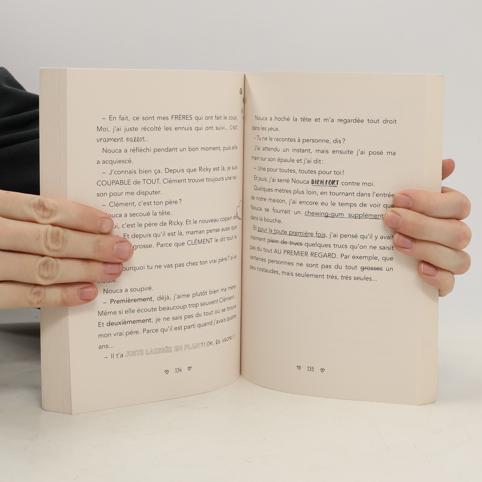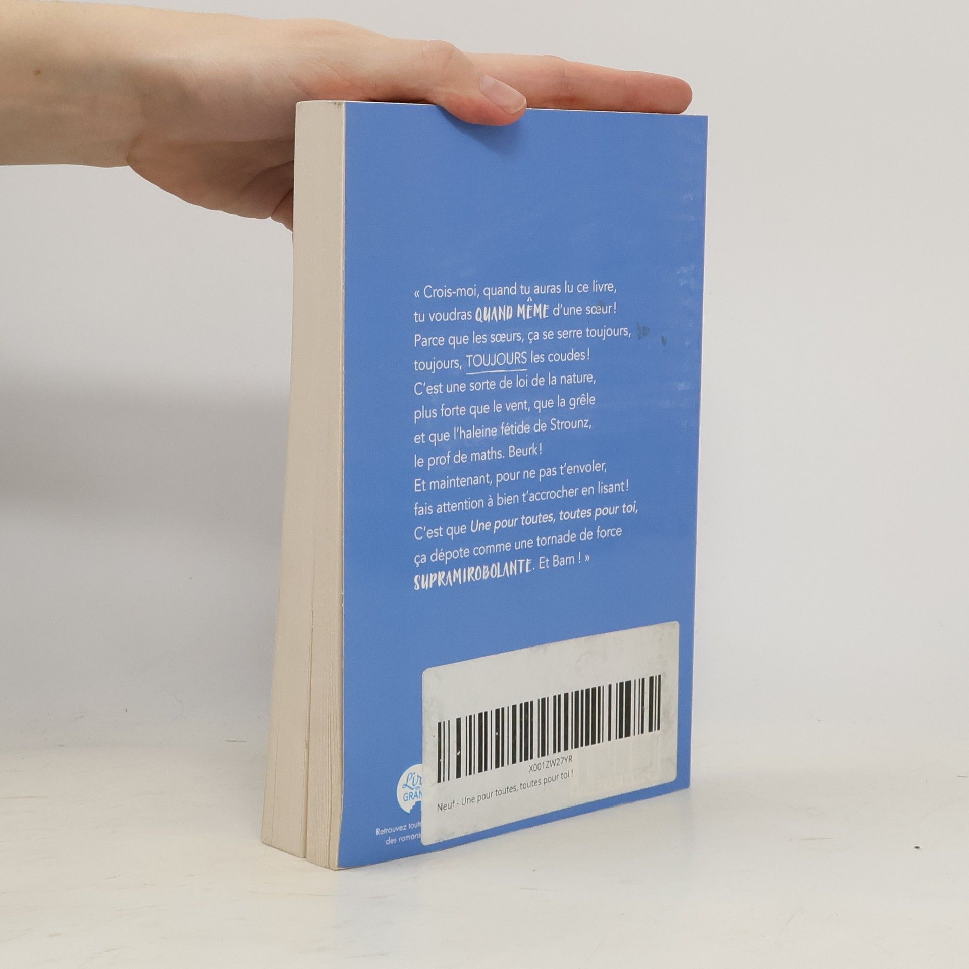 « Crois-moi, quand tu auras lu ce livre, tu voudras Quand mêne d'une soeur ! Parce que les soeurs, ça se serre toujours, toujours, Toujours les coudes ! C'est une sorte de loi de la nature, plus forte que le vent, que la grêle et que l'haleine fétide de Strounz, le prof de maths. Beurk ! Et maintenant, pour ne pas t'envoler, fais attention à bien t'accrocher en lisant ! C'est que Une pour toutes, toutes pour toi, ça dépote comme une tornade de force Supramirobolante. Et Bam ! ».