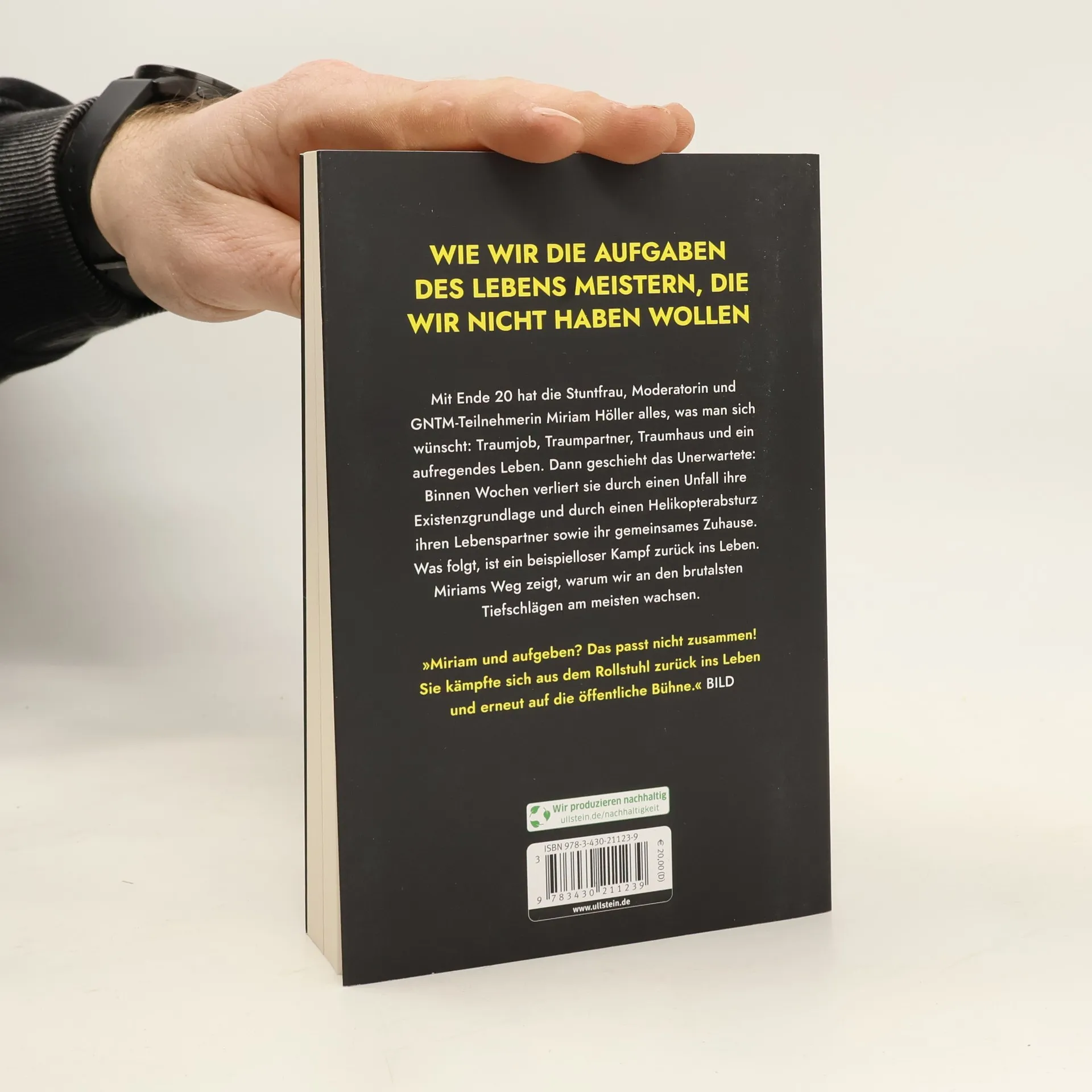 Wie wir die Aufgaben des Lebens meistern, die wir nicht haben wollen Miriam Höller hat stets am Limit gelebt – bis das Leben ihr harte Grenzen zeigte. Bekannt als eine der wenigen Stuntfrauen Deutschlands, Moderatorin des Motormagazins Grip und Teilnehmerin von Germany’s Next Topmodel, war sie schon als Kind eher Wildfang als Prinzessin. Bereits bei ihrer Lebensplanung überlässt sie nichts dem Zufall: Als Teenagerin für ihren Berufswunsch als Stuntfrau belächelt, hat sie mit 18 ihr erstes Profi-Engagement und gründet mit Mitte 20 ihr eigenes Stuntteam. Ihr Markenzeichen wird die einzigartige Kombination von Ästhetik und Action. Doch auch der größte Erfolg schützt nicht vor Ungerechtigkeit. Plötzlich treffen sie zwei Schicksalsschläge nacheinander: Als sie sich bei einem Helikopter-Stunt in High Heels beide Füße bricht, findet ihre Karriere ein jähes Ende. Wenig später stirbt ihr Lebenspartner bei einem Hubschrauberabsturz. Eindringlich und lebensbejahend schildert Miriam Höller, wie sie wieder auf die Beine gekommen ist – und wie wir noch an der schwersten Krise wachsen können. »Miriam und aufgeben? Das passt nicht zusammen! Sie kämpfte sich aus dem Rollstuhl zurück ins Leben und erneut auf die öffentliche Bühne.« BILD »Dass sie nicht verzweifelte, grenzt an ein Wunder.« Frau im Spiegel