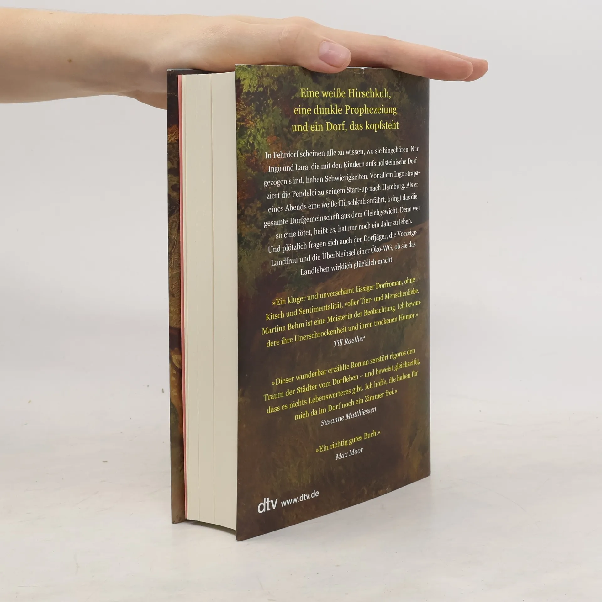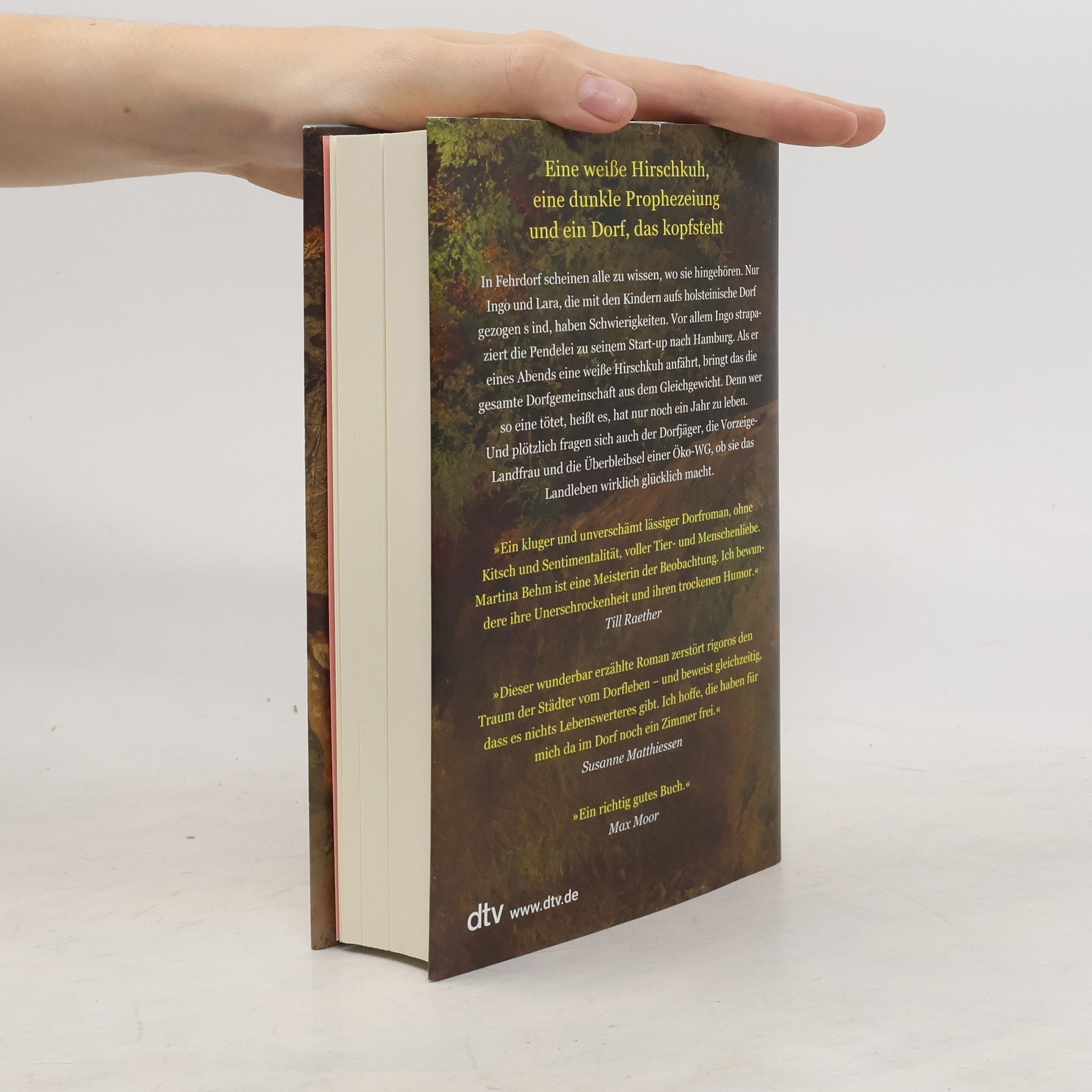 Eine weiße Hirschkuh, eine dunkle Prophezeiung und ein Dorf, das kopfstehtIn Fehrdorf scheinen alle zu wissen, wo sie hingehören. Nur Ingo und Lara, die mit den Kindern von der Großstadt aufs holsteinische Dorf gezogen sind, haben Schwierigkeiten. Vor allem Ingo strapaziert die Pendelei zu seinem Start-Up nach Hamburg. Als er eines Abends eine weiße Hirschkuh anfährt, bringt das die gesamte Dorfgemeinschaft aus dem Gleichgewicht. Denn wer so eine tötet, heißt es, hat nur noch ein Jahr zu leben. Und plötzlich fragen sich auch der Dorfjäger, die Vorzeige-Landfrau und die Überbleibsel einer Öko-WG, ob sie das Landleben wirklich glücklich macht.