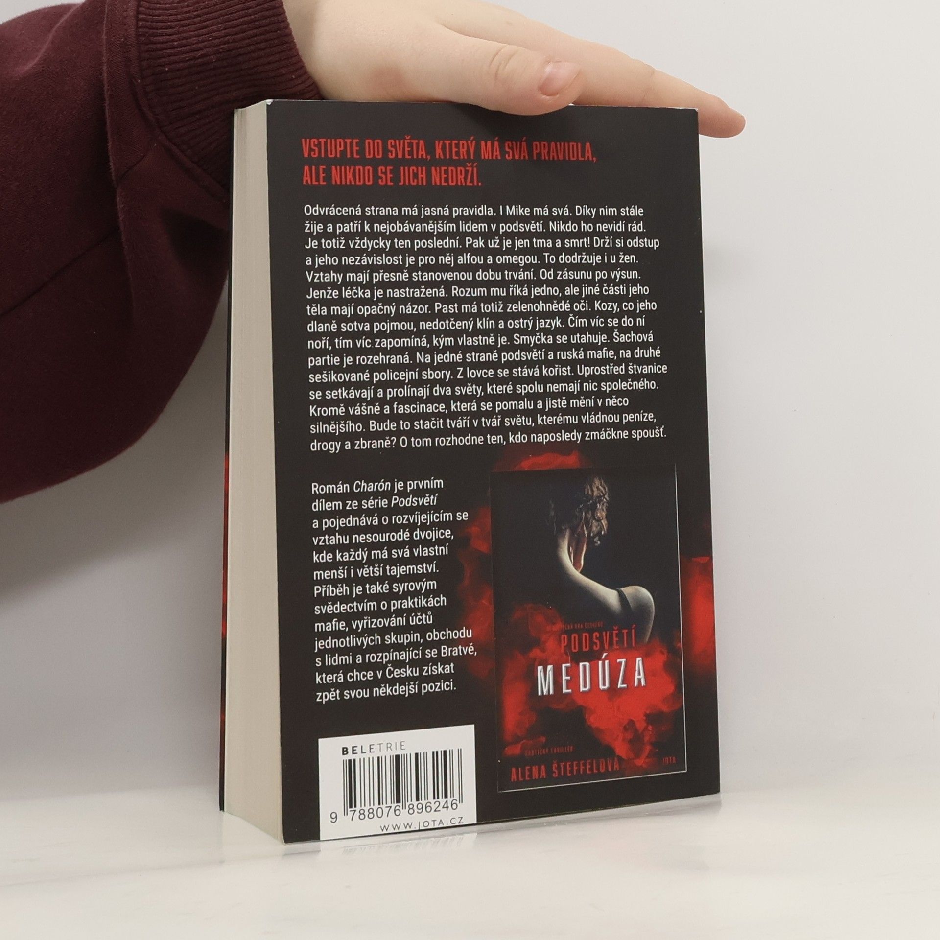 Když si zahráváš s ohněm, můžeš se spálit.Odvrácená strana má jasná pravidla. I Mike má svá. Díky nim stále žije a patří k nejobávanějším lidem v podsvětí. Nikdo ho nevidí rád. Je totiž vždycky ten poslední. Pak už je jen tma a smrt! Drží si odstup a jeho nezávislost je pro něj alfou a omegou. To dodržuje i u žen. Vztahy mají přesně stanovenou dobu trvání. Od zásunu po výsun. Jenže léčka je nastražená. Rozum mu říká jedno, ale jiné části jeho těla mají opačný názor. Past má totiž zelenohnědé oči. Kozy, co jeho dlaně sotva pojmou, nedotčený klín a ostrý jazyk. Čím víc se do ní noří, tím víc zapomíná, kým vlastně je.Smyčka se utahuje. Šachová partie je rozehraná. Na jedné straně podsvětí a ruská mafie, na druhé sešikované policejní sbory. Z lovce se stává kořist. Uprostřed štvanice se setkávají a prolínají dva světy, které spolu nemají nic společného. Kromě vášně a fascinace, která se pomalu a jistě mění v něco silnějšího. Bude to stačit tváří v tvář světu, kterému vládnou peníze, drogy a zbraně? O tom rozhodne ten, kdo naposledy zmáčkne spoušť.Román Charón je první díl série erotických thrillerů z českého podsvětí o rozvíjejícím se vztahu nesourodé dvojice, kde každý má svá menší i větší tajemství. Charón je drsné svědectví o praktikách podsvětí v Česku; syrové vyprávění se strhujícím dějem, nečekanými zápletkami a sarkasmem na každé stránce.Vstupte do světa, který má svá pravidla, ale nikdo se jich nedrží. Vstupte do Podsvětí.