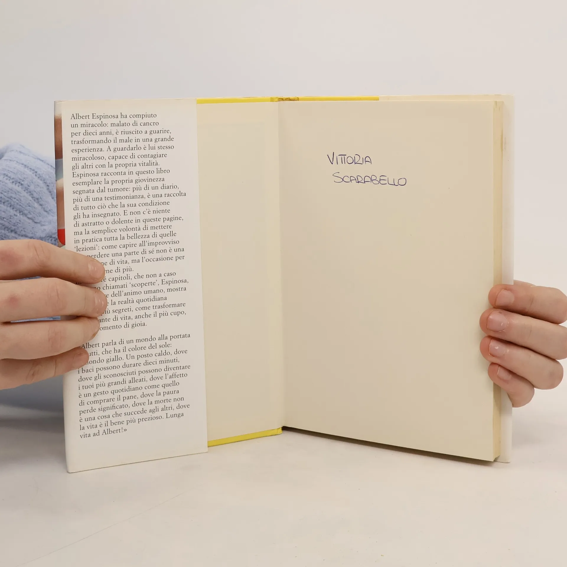L'autor, que va patir càncer durant 10 anys, ens transmet tot el bo que va aprendre de la malaltia. «El món groc és un món fantàstic que vull compartir amb tu, és el món dels descobriments que vaig fer durant els deu anys que vaig estar malalt de càncer. És curiós, però la força, la vitalitat i les troballes que fas quan estàs malalt serveixen també per quan estàs bo, en el dia a dia. Aquest llibre et farà conèixer i entrar en aquest món especial i diferent, però sobretot et farà descobrir els «grocs»: el nou esglaó de l'amistat, les persones que no són ni els amants ni els amics, aquella gent que s'encreua a la teva vida i que amb una sola conversa pot arribar a fer-la canviar. No t'avanço res més, hauràs de llegir el llibre per poder començar a trobar els teus «grocs». Potser un d'ells sigui jo... El món groc parla de com és de senzill creure en els somnis perquè es facin realitat. I és que creure i crear només són a molt poques lletres de distància. A què esperes per saber qui són els teus «grocs», la nova manera de veure l'amistat!» Albert Espinosa
