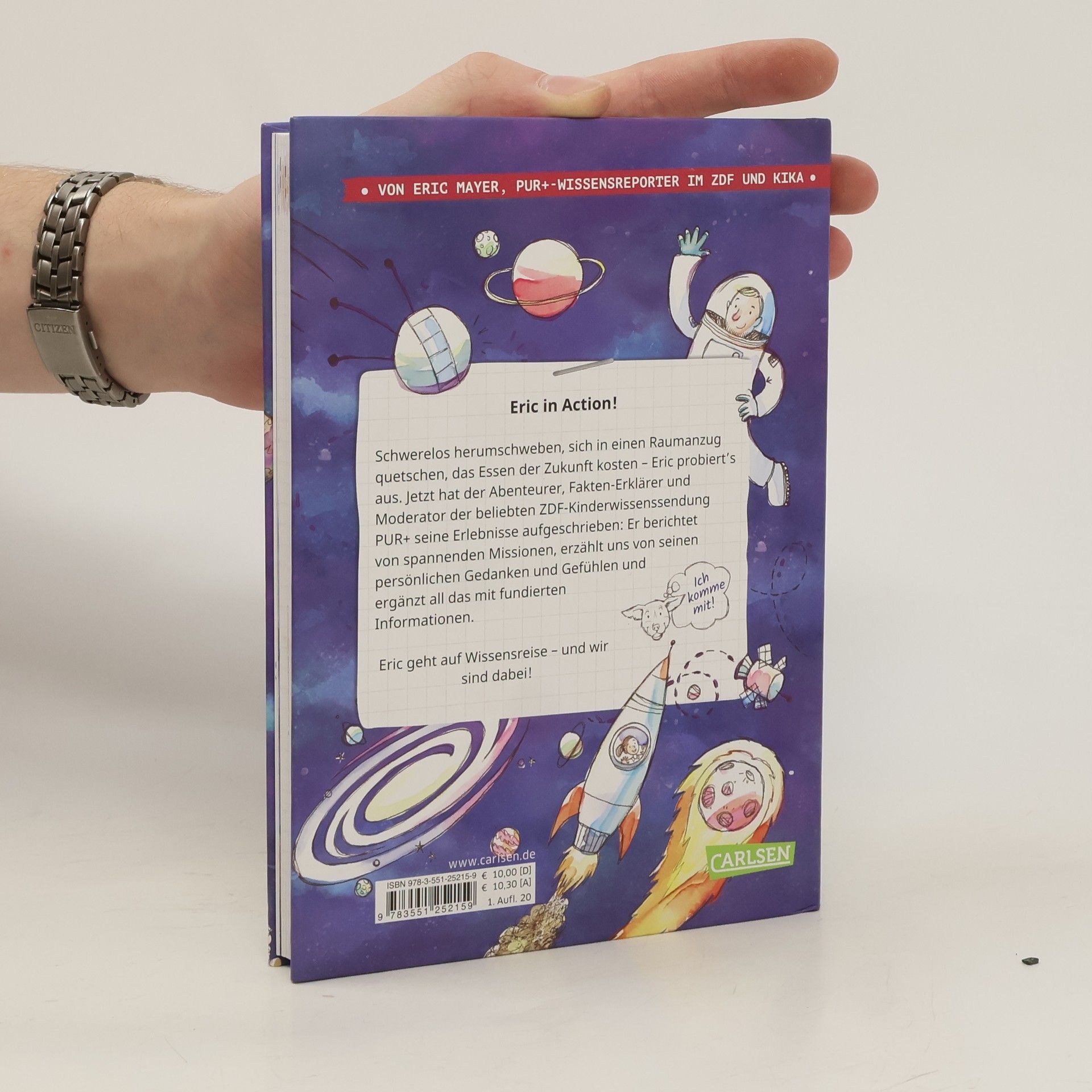 Eric in Action! Für die beliebte ZDF-Kinderwissenssendung PUR+ hat Eric einen Parabelflug überstanden, das Essen der Zukunft probiert, sich in einen Raumanzug gequetscht und vieles mehr. Eric probiert's aus und geht der Eroberung des Weltalls auf den Grund! Jetzt hat der Abenteurer, Fakten-Erklärer und Reporter seine Erlebnisse aufgeschrieben: Er berichtet von spannenden Missionen, erzählt uns von seinen persönlichen Gedanken und Gefühlen und ergänzt all das mit fundierten Informationen. Denn Eric weiß, wie es sich anfühlt, schwerelos herumzuschweben, aber auch, was genau Schwerelosigkeit eigentlich ist. Und: In seinem "Eric erforscht"-Podcast führt er spannende Gespräche mit Menschen, die noch mehr über das Weltall berichten können. Weitere Infos dazu unter ericerforscht.carlsen.de Eric geht auf Wissensreise - und wir sind dabei! Für abenteuerlustige Kinder ab 8.