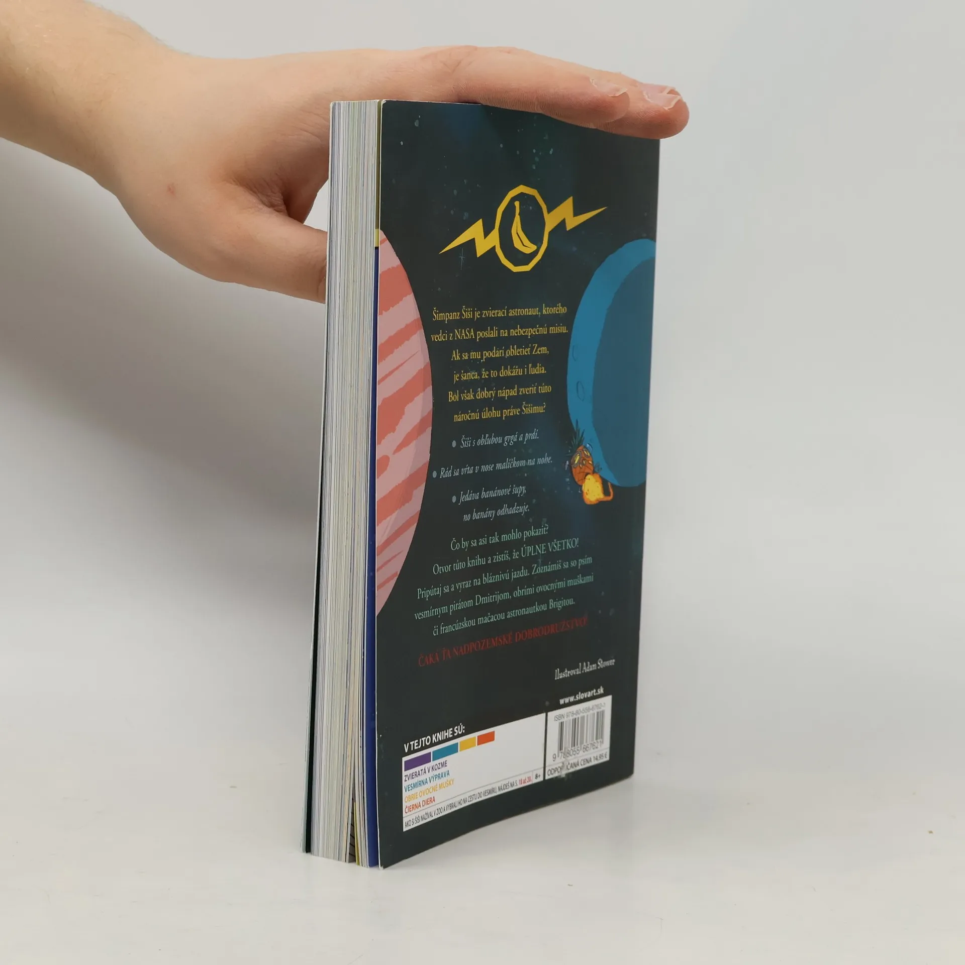 Z fantastického sveta najobľúbenejšieho detského spisovateľa Davida Walliamsa k vám letí prvý KOZMICKÝ KOMIKS! Šimpanz Šiši je zvierací astronaut, ktorého vedci z NASA poslali na nebezpečnú misiu. Ak sa mu podarí obletieť Zem, je šanca, že to dokážu i ľudia. Bol však dobrý nápad zveriťtúto náročnú úlohu práve Šišimu? Posúďte sami: Šiši s obľubou grgá a prdí. Rád sa vŕta v nose malíčkom na nohe. Jedáva banánové šupy, no banány odhadzuje. Čo by sa asi tak mohlo pokaziť? Keď otvoríte túto knihu, zistíte, že ÚPLNE VŠETKO! Pripútajte sa a vyrazte na bláznivú jazdu, počas ktorej sa zoznámite so psím vesmírnym pirátom Dmitrijom, s obrími ovocnými muškami či francúzskou mačacou astronautkou Brigitou. Čaká vás nadpozemské dobrodružstvo!