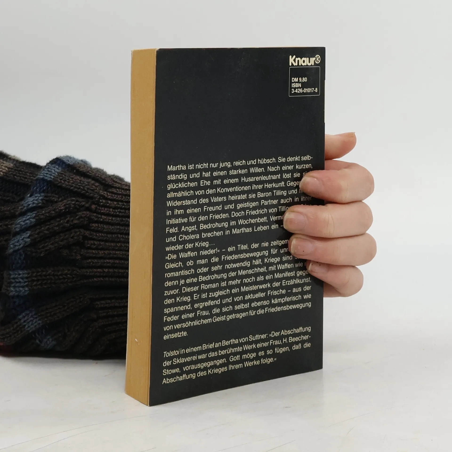 Martha ist nicht nur jung, reich und hübsch. Sei denkt selbstständig und hat einen starken Willen. Nach einer kurzen, glücklichen Ehe mit einem Husarenleutnant löst sie sich allmählich von den Konventionen ihrer Herkunft. Gegen den Widerstand des Vaters heiratet sie Baron Tilling und findet in ihm einen Freund und geistigen Partner auch in ihrer Initiative für den Frieden. Doch Friedrich von Tilling muß ins Feld. Angst Bedrohung im Wochenbett, Vermögensverlust und Cholera brechen in Marthas Leben ein - und immer wieder der Krieg... "Die Waffen nieder!" - ein Titel, der nie zeitgemäßer war. Gleich, ob man die Friedensbewegung für unrealistisch, romantisch oder für sehr notwendig hält, Kriege sind stärker denn je eine Bedrohung der Menschheit, mit Waffen wie nie zuvor. Dieser Roman ist mehr noch als ein Manifest gegen den Krieg. Es ist zugleich ein Meisterwerk der Erzählkunst, spannend, ergreifend un von aktueller Frische - aus der Feder einer Frau, die sich selbst ebenso kämfperisch wie von versöhlichem Geist getragen für die Friedensbewegung einsetzte. Tolstoi in einem Brief an Bertha von Suttner: "Der Abschaffung der Sklavernei war das berühmte Werk einer Frau, H. Beecher-Stowe, vorausgegangen. Gott möge es so fügen, daß die Abschaffung des Krieges Ihrem Werke folge." ~ Klappentext einer Ausgabe aus 1990