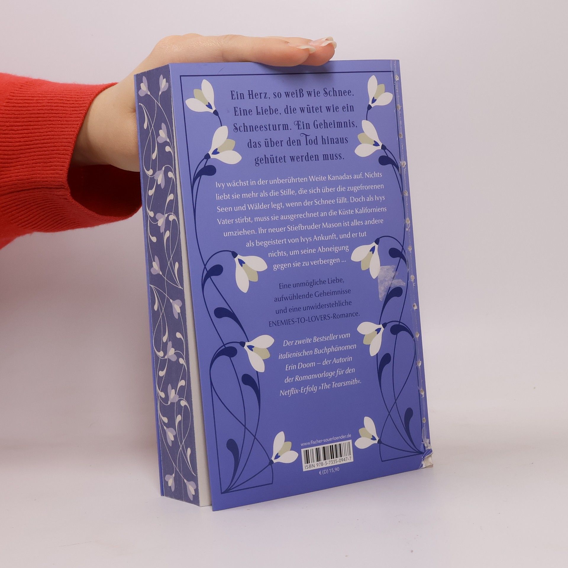 Nach dem Netflix-Erfolg: Die neue unwiderstehliche Enemies-to-Lovers-Romance von Erin Doom Ein Herz, so weiß wie Schnee. Eine Liebe, die wütet wie ein Schneesturm. Ein Geheimnis, das über den Tod hinaus gehütet werden muss. Ivy wächst in der unberührten Weite Kanadas auf. Nichts liebt sie mehr als die Stille, die sich über die zugefrorenen Seen und Wälder legt, wenn der Schnee fällt. Doch als Ivys Vater stirbt und damit ihre ganze Familie, muss sie ihre Herzenslandschaft hinter sich lassen. Ihr Patenonkel John und sein Sohn Mason sind bereit, sie in ihrem Zuhause an der Küste Kaliforniens aufzunehmen. Und so versucht Ivy, sich in den rauschenden Wellen ihres neuen Lebens über Wasser zu halten. Doch während die wunderschönen, aber eiskalten Augen ihres Stiefbruders sie um den Schlaf bringen, nimmt ein gefährliches Geheimnis aus der Vergangenheit Ivys Spur auf. Der zweite Bestseller vom italienischen Phänomen Erin Doom – der Autorin der Romanvorlage für den Netflix-Erfolg „The Tearsmith“. Eine neue unmögliche Liebe, aufwühlende Geheimnisse und eine unwiderstehliche Enemies-to-Lovers-Romance. In wunderschöner, hochwertiger Ausstattung mit farbigem Buchschnitt in limitierter Erstauflage und farbigen Innenklappen.