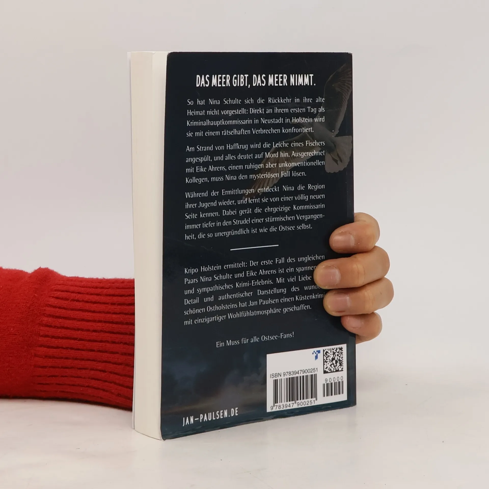 »Das Meer gibt, das Meer nimmt.« So hat Nina Schulte sich die Rückkehr in ihre alte Heimat nicht vorgestellt: Direkt an ihrem ersten Tag als Kriminalhauptkommissarin in Neustadt in Holstein wird sie mit einem rätselhaften Verbrechen konfrontiert. Am Strand von Haffkrug wird die Leiche eines Fischers angespült, und alles deutet auf Mord hin. Ausgerechnet mit Eike Ahrens, einem ruhigen aber unkonventionellen Kollegen, muss Nina den mysteriösen Fall lösen. Während der Ermittlungen entdeckt Nina die Region ihrer Jugend wieder, und lernt sie von einer völlig neuen Seite kennen. Dabei gerät die ehrgeizige Kommissarin immer tiefer in den Strudel einer stürmischen Vergangenheit, die so unergründlich ist wie die Ostsee selbst. Kripo Holstein ermittelt: Der erste Fall des ungleichen Paars Nina Schulte und Eike Ahrens ist ein spannendes und sympathisches Krimi-Erlebnis. Mit viel Liebe zum Detail und authentischer Darstellung des wunderschönen Ostholsteins hat Jan Paulsen einen Küstenkrimi mit einzigartiger Wohlfühlatmosphäre geschaffen. Ein Muss für alle Ostseekrimi-Fans!