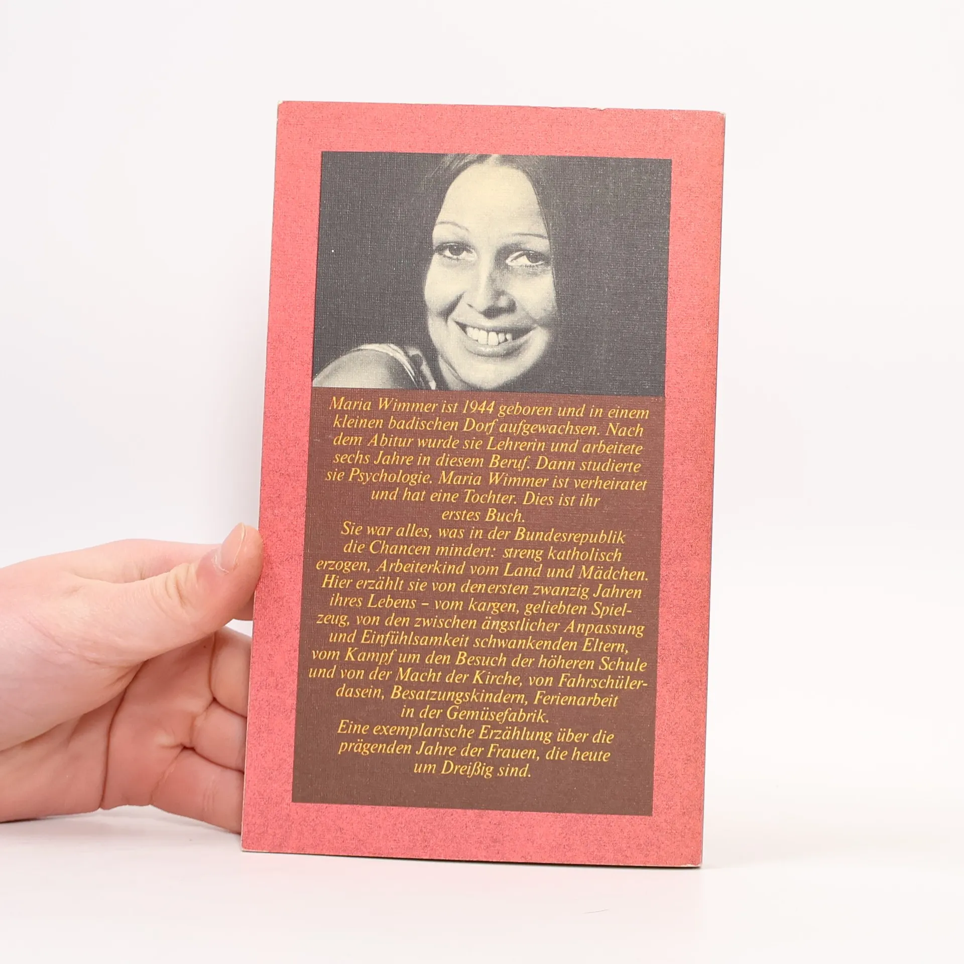 Maria Wimmer ist 1944 geboren und in einem kleinen badischen Dorf aufgewachsen. Sie war alles, was damals in der Bundesrepublik die Chancen minderte: streng katholisch erzogen, Arbeiterkind vom Land und Mädchen. Nach dem Abitur wurde sie Lehrerin und arbeitete sechs Jahre in diesem Beruf. Dann studierte sie Psychologie.