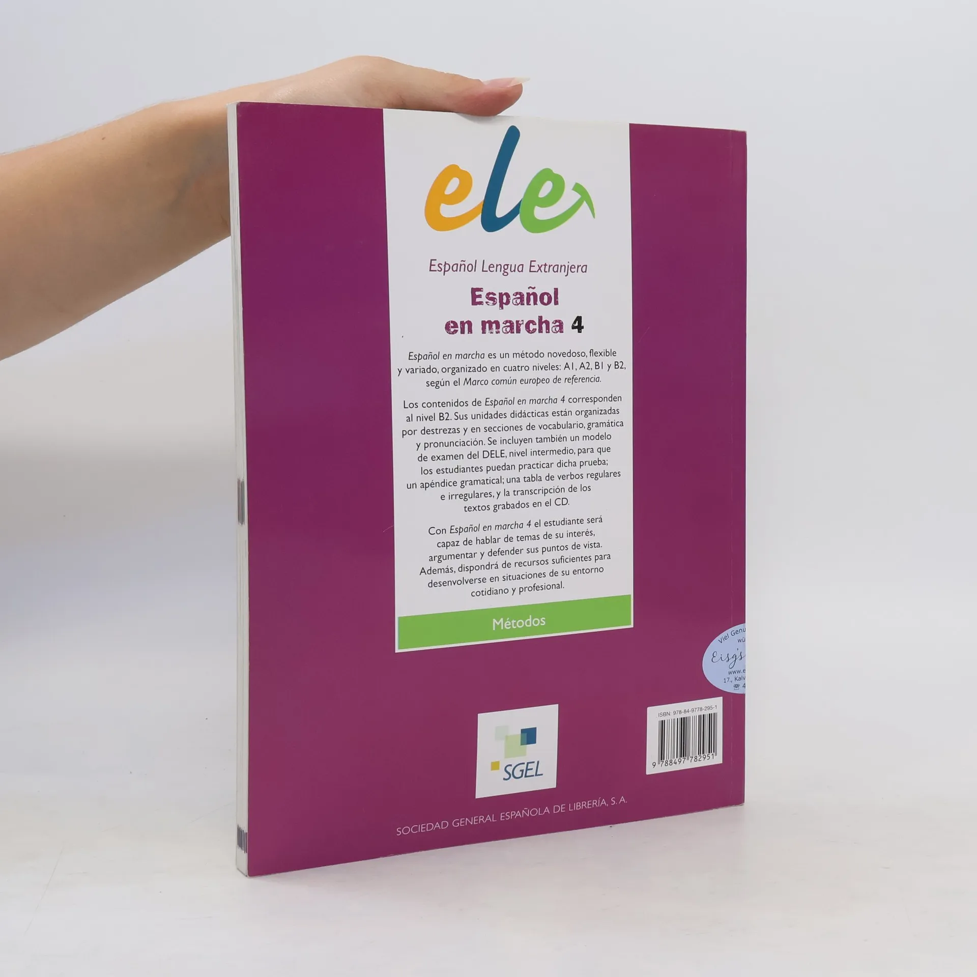 Método comunicativo dirigido a jóvenes y adultos dividido en cuatro niveles, Español en marcha 1 se corresponde con el nivel B2 del MCER. Ofrece una secuenciación graduada desde la presentación de la muestra de lengua hasta las actividades finales de producción. Desarrolla la competencia comunicativa, la interacción y la reflexión sobre el proceso de aprendizaje. Contiene gran variedad de material ideas y juegos, actividades en pareja, actividades de expresión escrita, lecturas extras y exámenes. También ofrece modelos de preparación al DELE en los niveles B1 y B2.