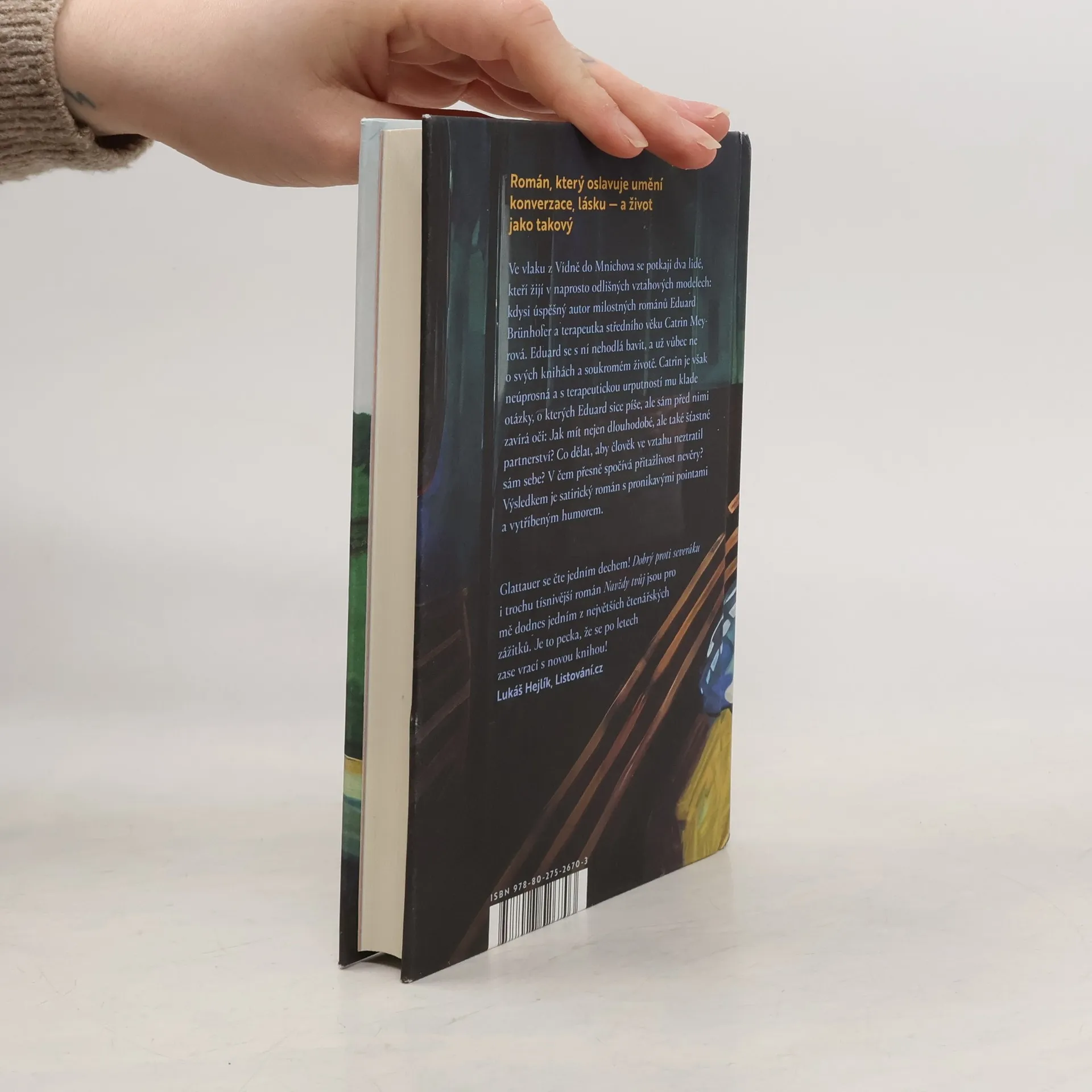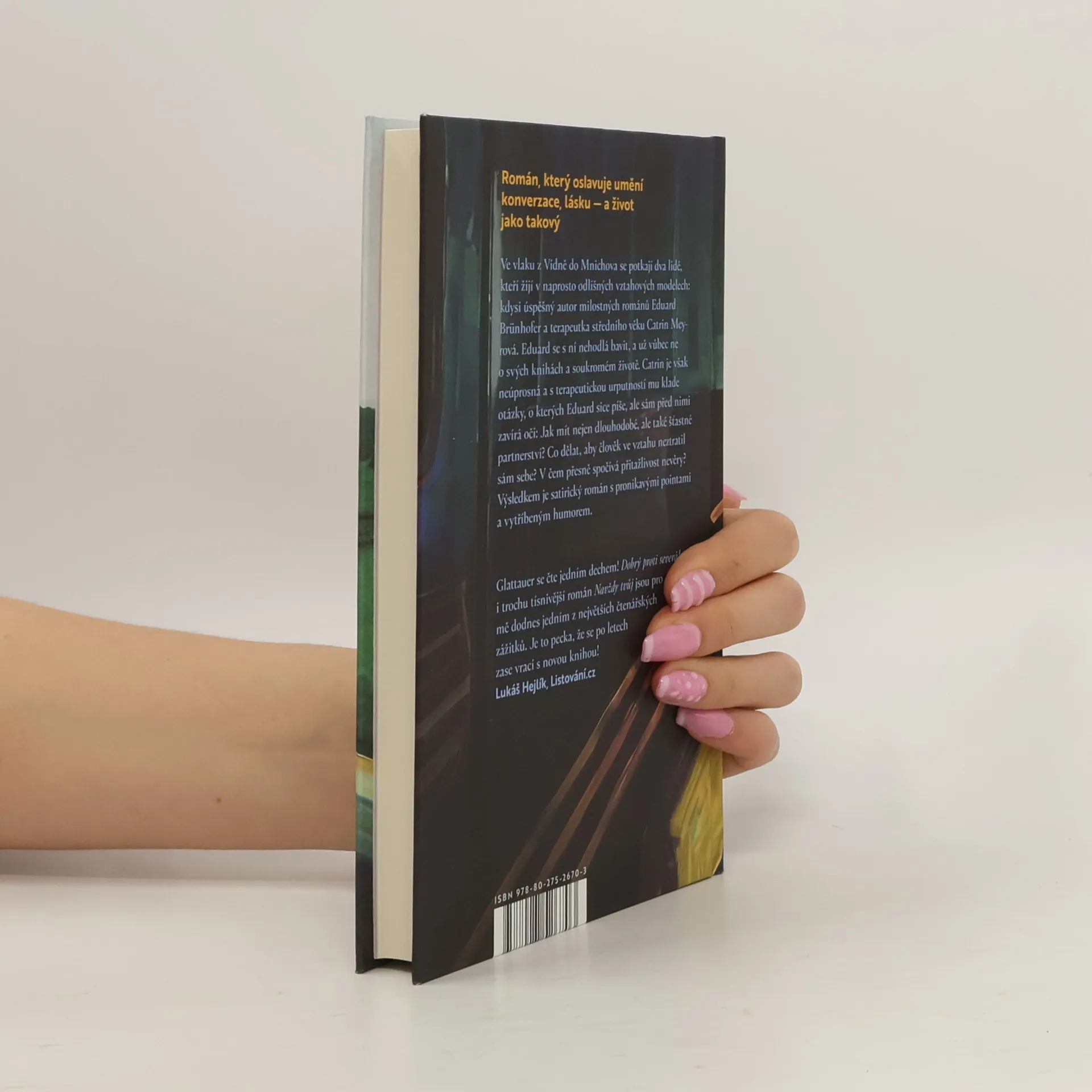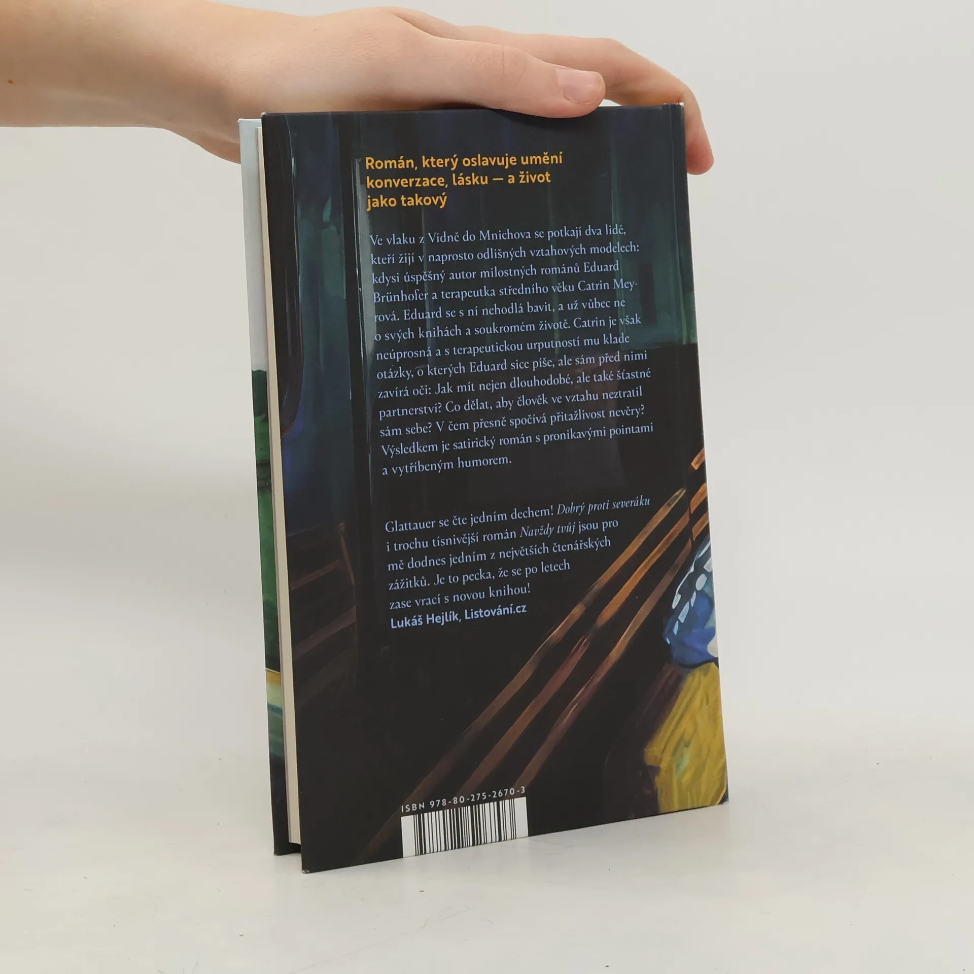 Román, který oslavuje umění konverzace, lásku — a život jako takový Ve vlaku z Vídně do Mnichova se náhodou potkají dva lidé, kteří žijí v naprosto odlišných vztahových modelech: kdysi úspěšný autor milostných románů Eduard Brünhofer a terapeutka středního věku Catrin Meyrová. Eduard se s ní nehodlá bavit, a už vůbec ne o svých knihách a milostném životě. Catrin je však neúprosná a s terapeutickou urputností mu klade otázky, o kterých Eduard sice píše, ale sám před nimi zavírá oči: Jak spolu zůstat nejen dlouho, ale také šťastní? Co dělat, aby člověk ve vztahu neztratil sám sebe? V čem přesně spočívá přitažlivost nevěry? Výsledkem je satirický román s pronikavými pointami a vytříbeným humorem.