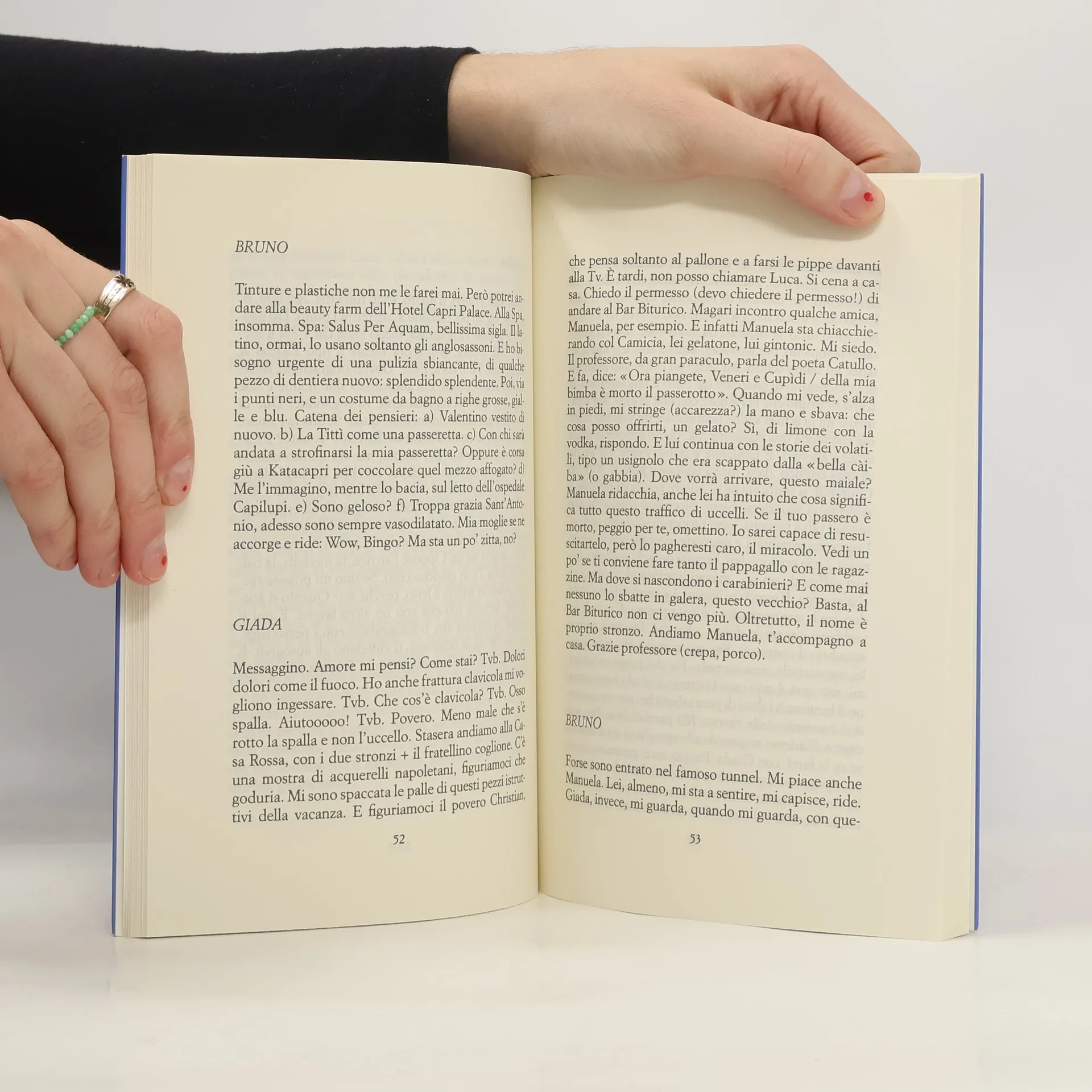In questo romanzo, che l'autore ha scelto di firmare con uno pseudonimo, si alternano le voci di due personaggi: Giada, ragazzina non ancora quattordicenne, e Bruno, professore sessantaduenne, abbastanza conosciuto per le sue apparizioni televisive. Si incontrano, o meglio, si vedono in una Capri estiva, assonnata e turbolenta, tradizionale e postmoderna. Lei è figlia di un gommista, e i suoi genitori cercano promozioni culturali e sociali: un'adolescente smaniosa di scoperte e soprattutto di sesso. Lui, che affitta una casa nell'amatissima Anacapri, ha un'eterna moglie con la quale ha infelicemente sperimentato, in anni passati, l'ideologia della coppia aperta e si sta fabbricando un'analisi impietosa/morbosa della propria vita