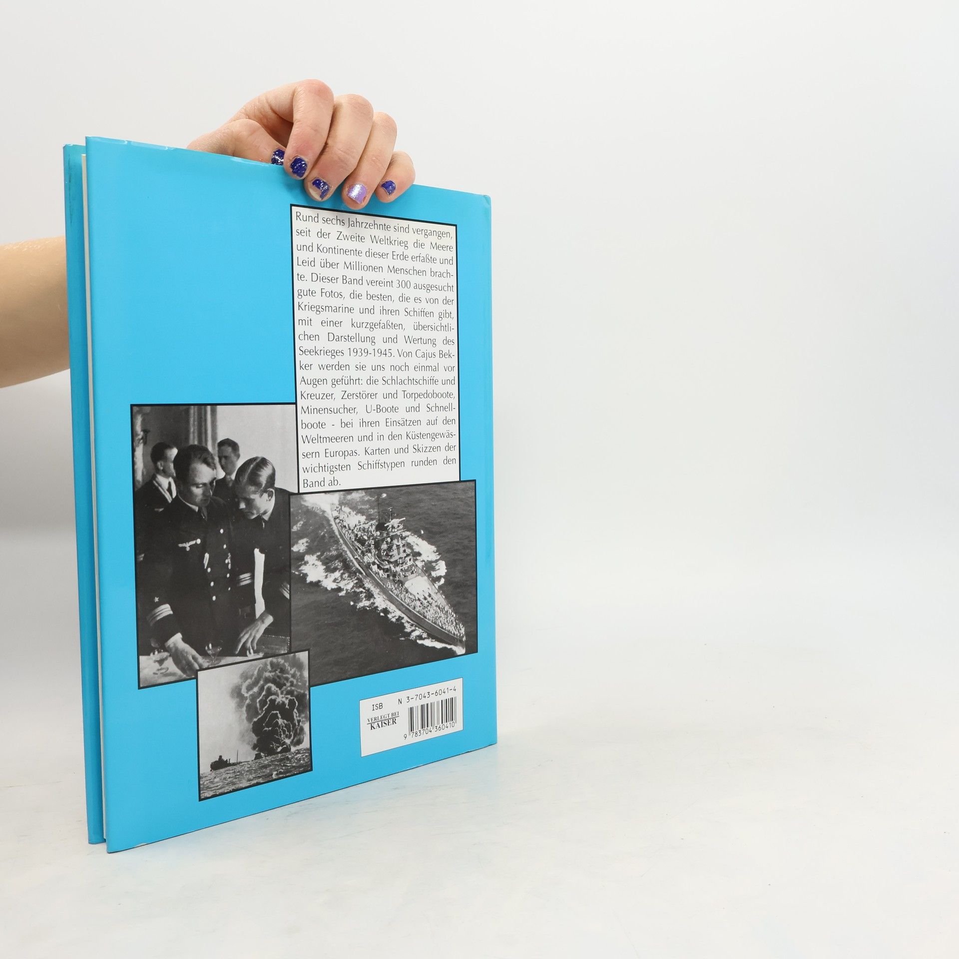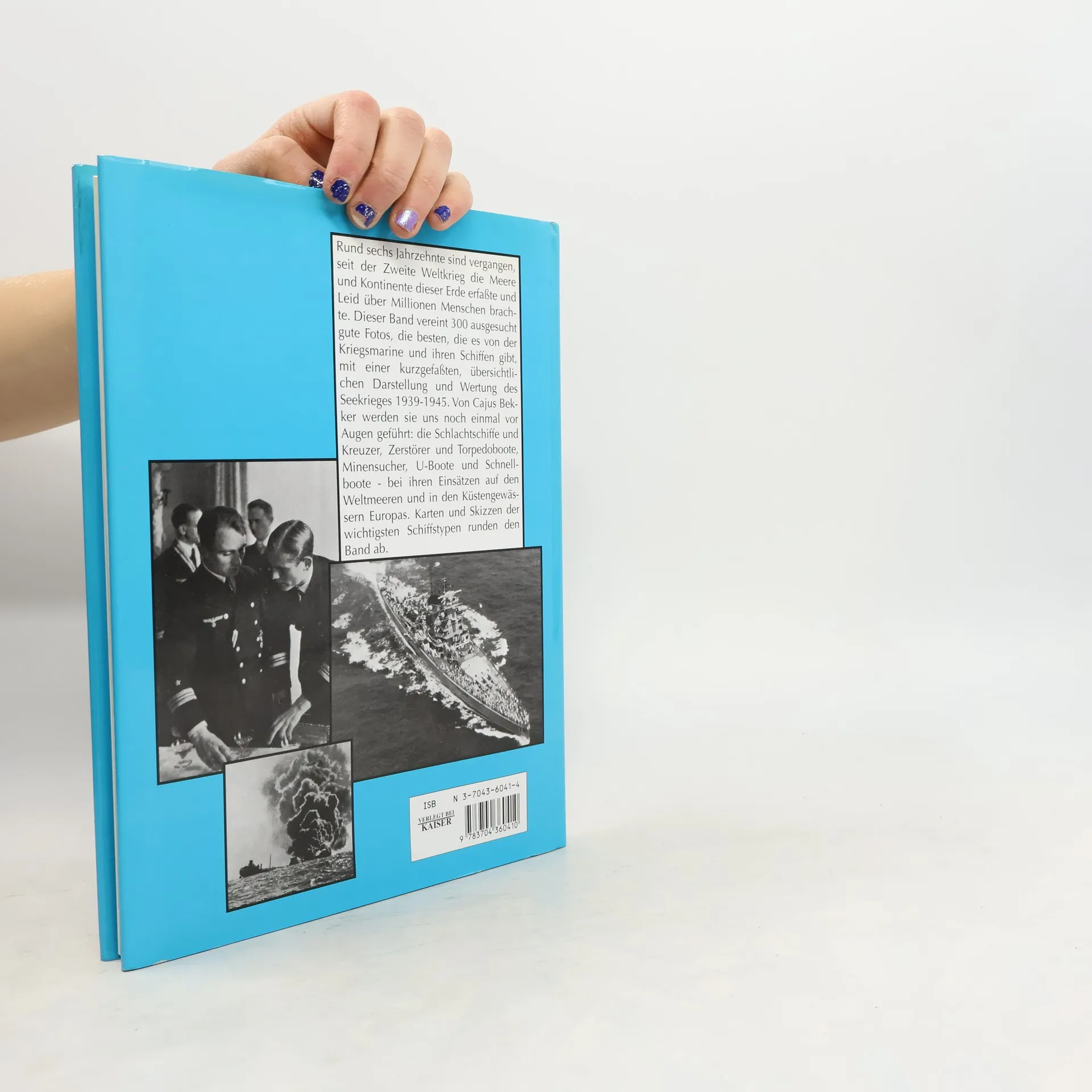 Rund sechs Jahrzehnte sind vergangen, seit der Zweite Weltkrieg die Meere und Kontinente dieser Erde erfasste und Leid über Millionen Menschen brachte. Dieser Band vereint 300 ausgesucht gute Fotos, die besten, die es von der Kriegsmarine und ihren Schiffen gibt, mit einer übersichtlichen Darstellung und Wertung des Seekrieges 1939 – 1945. Von Cajus Bekker werden sie uns noch einmal vor Augen geführt: Die Schlachtschiffe und Kreuzer, Zerstörer und Torpedoboote, Minensucher, U-Boote und Schnellboote – bei ihren Einsätzen auf den Weltmeeren und in den Küstengewässern Europas. Karten und Skizzen der wichtigsten Schiffstypen runden den Band ab.