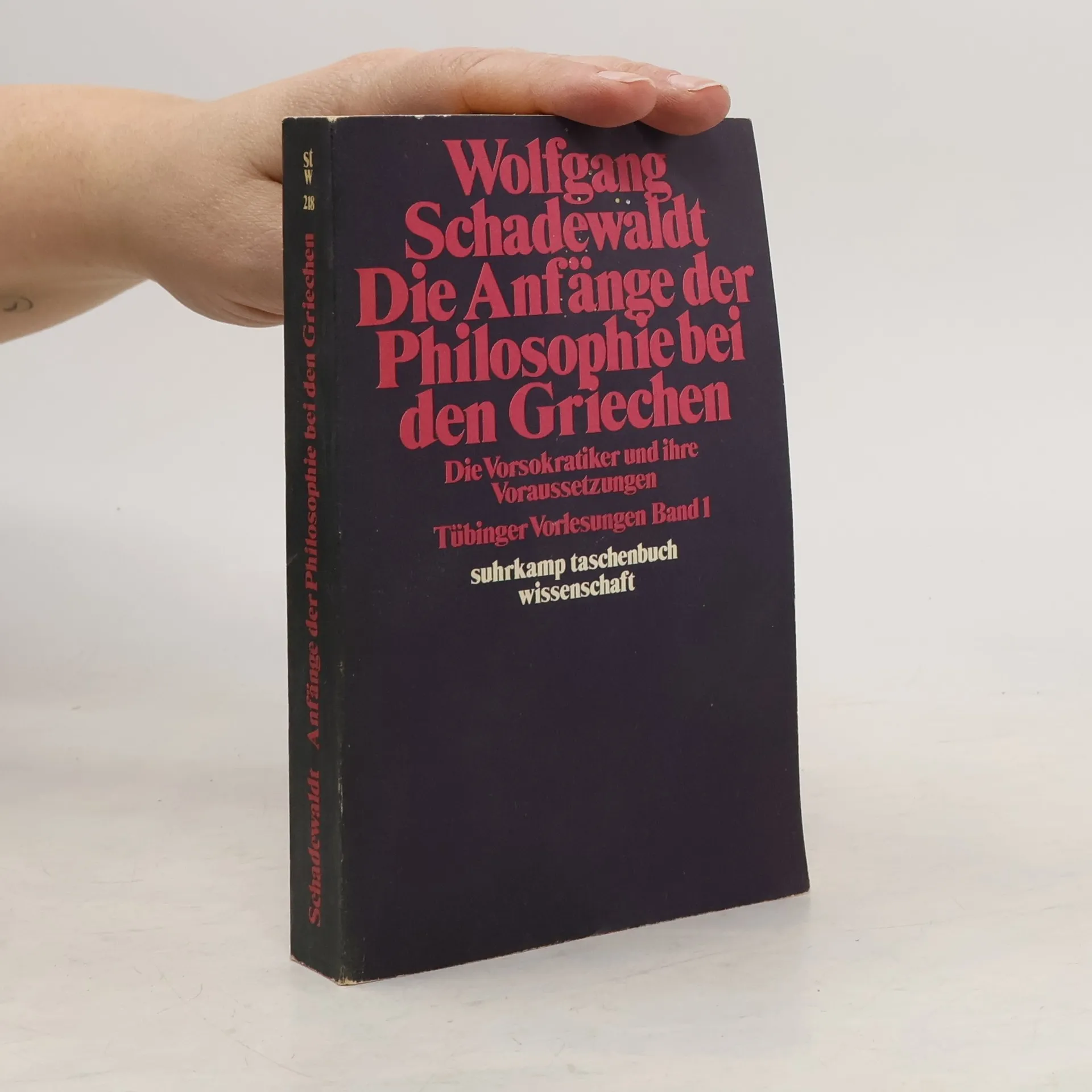 Band 1 der Tübinger Vorlesungen Wolfgang Schadewaldts aus den Jahren 1950-1972 thematisiert die frühgriechische Philosophie vor ihrer Wende durch Sokrates. Ausgehend von den Anfängen des griechischen Denkens, dem Bild des Kosmos und des Menschen bei Homer, der Spekulation über Weltentstehung und Weltordnung in der Lehrdichtung Hesiods, der aus einer neuen Gesellschaft erwachsenen, politisch-philosophische Rechtsideen entwickelnden Elegiendichtung Solons erweist Schadewaldt im ersten Teil der Vorlesung die Präformation der Philosophie in der griechischen Sprache, ihrer Grammatik, ihrer Struktur. Dem schließt sich an eine Herkunfts- und Bedeutungsanalyse der bis auf Platon und Aristoteles wirksamen und noch heute denkerisch verwendeten philosophischen Begriffe. Die beiden Hauptteile der Vorlesung betreffen die erhaltenen Fragmente der vorsokratischen Philosophen wie die indirekten Zeugnisse über sie.
