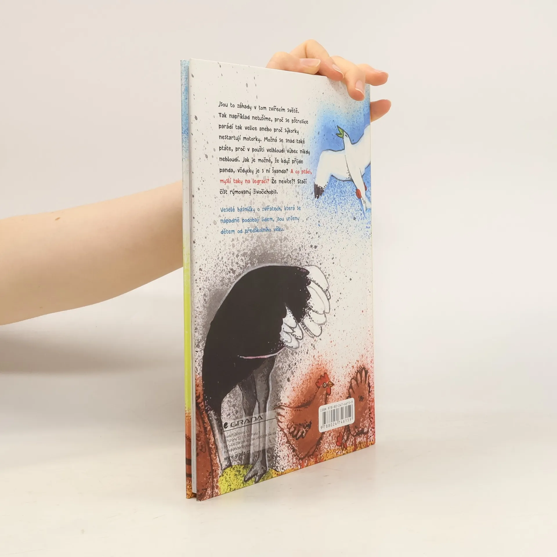 Jsou to záhady v tom zvířecím světě. Tak například netušíme, proč se pštrosice parádí tak velice anebo proč sýkorky nestartují motorky. Možná se snad také ptáte, proč v poušti velbloudi vůbec nikdy nebloudí. Jak je možné, že když přijde panda, vždycky je s ní švanda? A co ptáci, myslí taky na legraci? Že nevíte?! Stačí číst rýmovaný živočichopis. Veselé básničky o zvířatech, která se nápadně podobají lidem, jsou určeny pro děti od předškolního věk