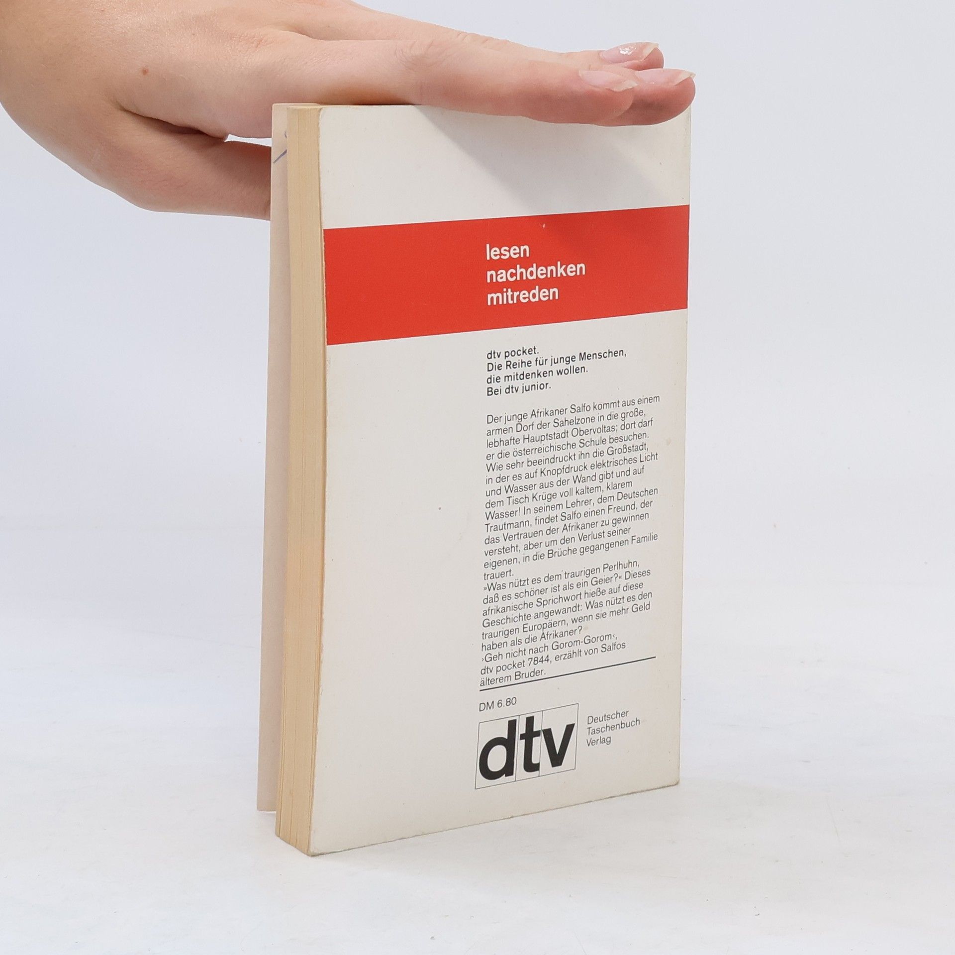 Salfo kommt aus einem armen Dorf der Sahelzone in die große lebhafte Hauptstadt Obervoltas,dort darf er die österreichische Schule besuchen.Wie sehr beeindruckt ihn die Großstadt in der es auf Knopfdruck elektrisches Licht und Wasser aus der Wand gibt und aud dem Tisch Krüge voll kaltem,klarem Wasser! In seinem Lehrer,dem Deutschen Trautmann,findet Salfo einen Freund,der das Vertrauen der Afrikaner zu gewinnen versteht,aber um den Verlust seiner eigenen,in die Brüche gegangenen Familie trauert.