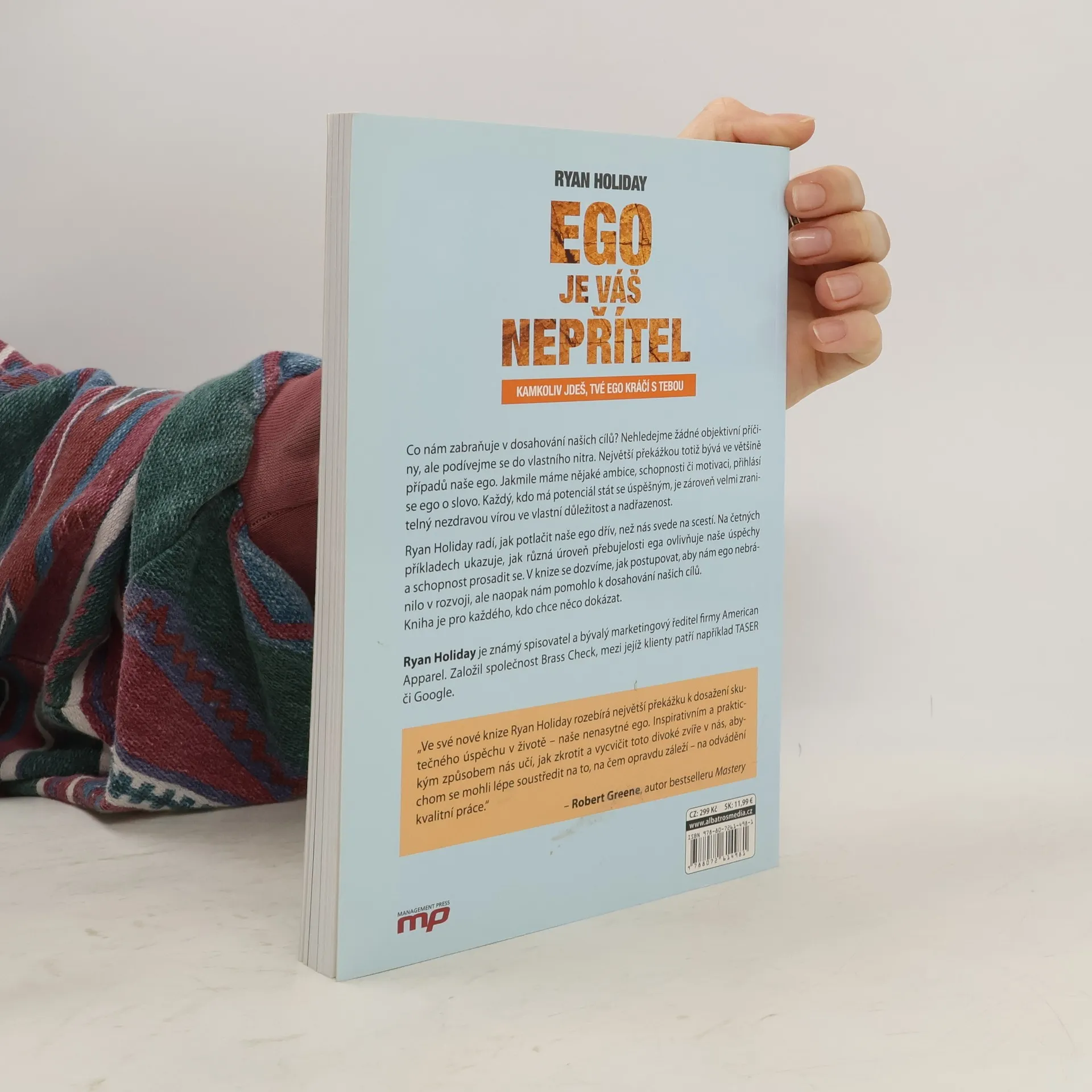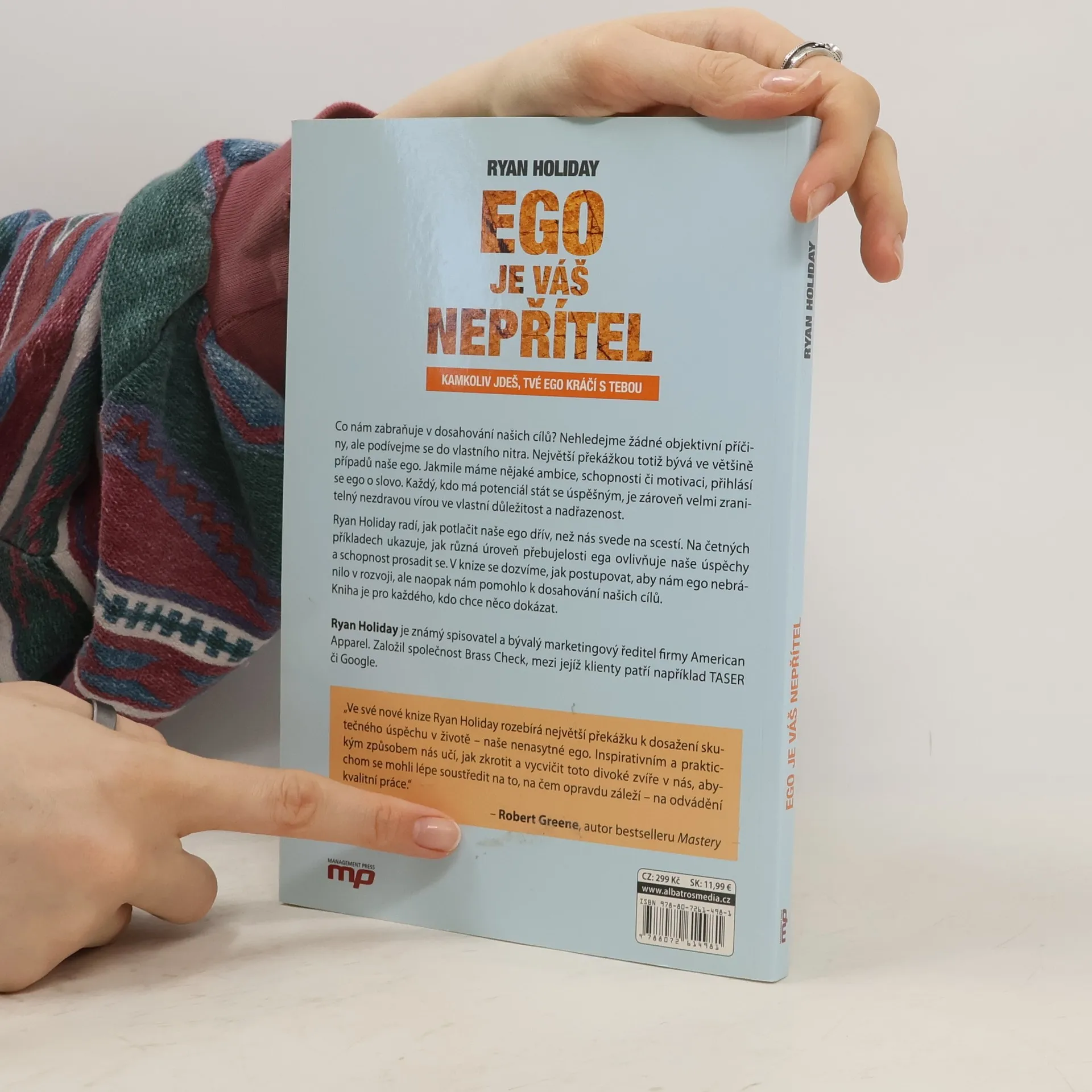 Ryan Holiday ve své nové knize zkoumá ego jako největší překážku na cestě k mistrovství a úspěchu. Učí nás, jak zkrotit toto divoké zvíře v nás, abychom se mohli soustředit na kvalitní práci. Ego se projevuje u každého, kdo má ambice a potenciál, a to, co nás činí úspěšnými, nás zároveň činí zranitelnými vůči aroganci a sebestřednosti. Autor se snaží pomoci potlačit ego dříve, než nás jeho negativní důsledky svedou na scestí. Ukazuje, jak různé úrovně ega ovlivňují úspěch a schopnost prosadit se. Ego nás často svazuje a brání nám v realistickém posouzení našich schopností, což může vést k bolestným pádům. Kniha, která se stala bestsellerem, nabízí návod, jak se vyhnout překážkám, které ego představuje, a jak rozvíjet pokoru a vnitřní disciplínu. V dnešní době, která glorifikuje internet a sebeprosazování, je boj proti přebujelým egům zásadní. Kniha obsahuje nezapomenutelné příběhy z historie i současnosti a životní lekce, které by si měl přečíst každý, kdo chce něco skutečně dokázat. Ryan Holiday je renomovaný spisovatel a bývalý marketingový ředitel American Apparel, zakladatel společnosti Brass Check.