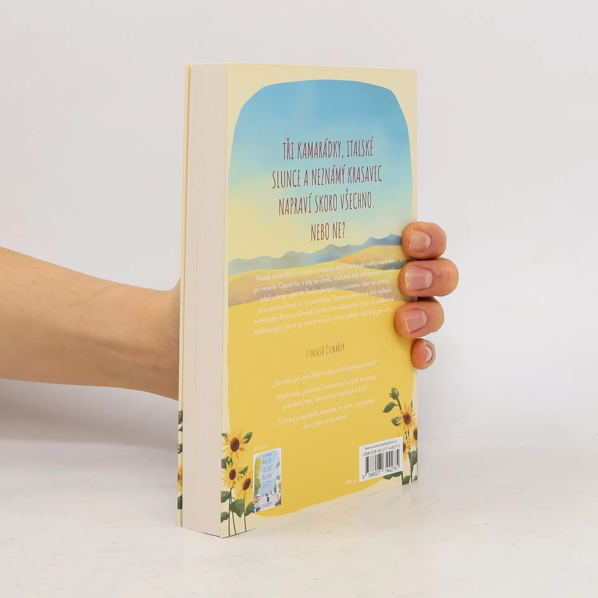 Maisie Knightová má všechno. Úžasného manžela. Úspěšný podnik. Krásný domov.Jenže jednoho dne o všechno přijde – načapá svého manžela při nevěře. Když ale vyhraje dovolenou v Itálii, nemůže se týdne pod toskánským sluníčkem dočkat.Se svými nejlepšími kamarádkami Cheryl a Emmou, které vezme s sebou, vyrazí na dámskou jízdu do vily Marisa. Pole zlatých slunečnic by mohla být dokonalým lékem na Maisiino zlomené srdce – a místní farmář, podezřele dokonalý Gianni s hustými černými vlasy a usměvavýma očima, jí poskytne vítané rozptýlení.Rána, kdy ji probouzí vůně čerstvé kávy, pohledy na zvlněné kopce, jízdy na mopedu s přidrzlými Italy a báječné těstoviny s proseccem Maisie pomůžou zapomenout na její problémy. Samotnou ji překvapí, že po tom všem trápení, které zažila, začne důvěřovat Giannimu – a ještě víc ji udiví žár, který ji v jeho přítomnosti zaplavuje, a není to vinou horkého italského slunce…Na tak krásný život by si Maisie dokázala zvyknout, ale zrovna když se jí vrací jiskra, stane se něco strašného. V jediném okamžiku ji dohoní minulost, otevře staré rány a Maisie musí učinit rozhodnutí, které jí změní život. Má se snad rozloučit s létem plným lásky a limoncella?