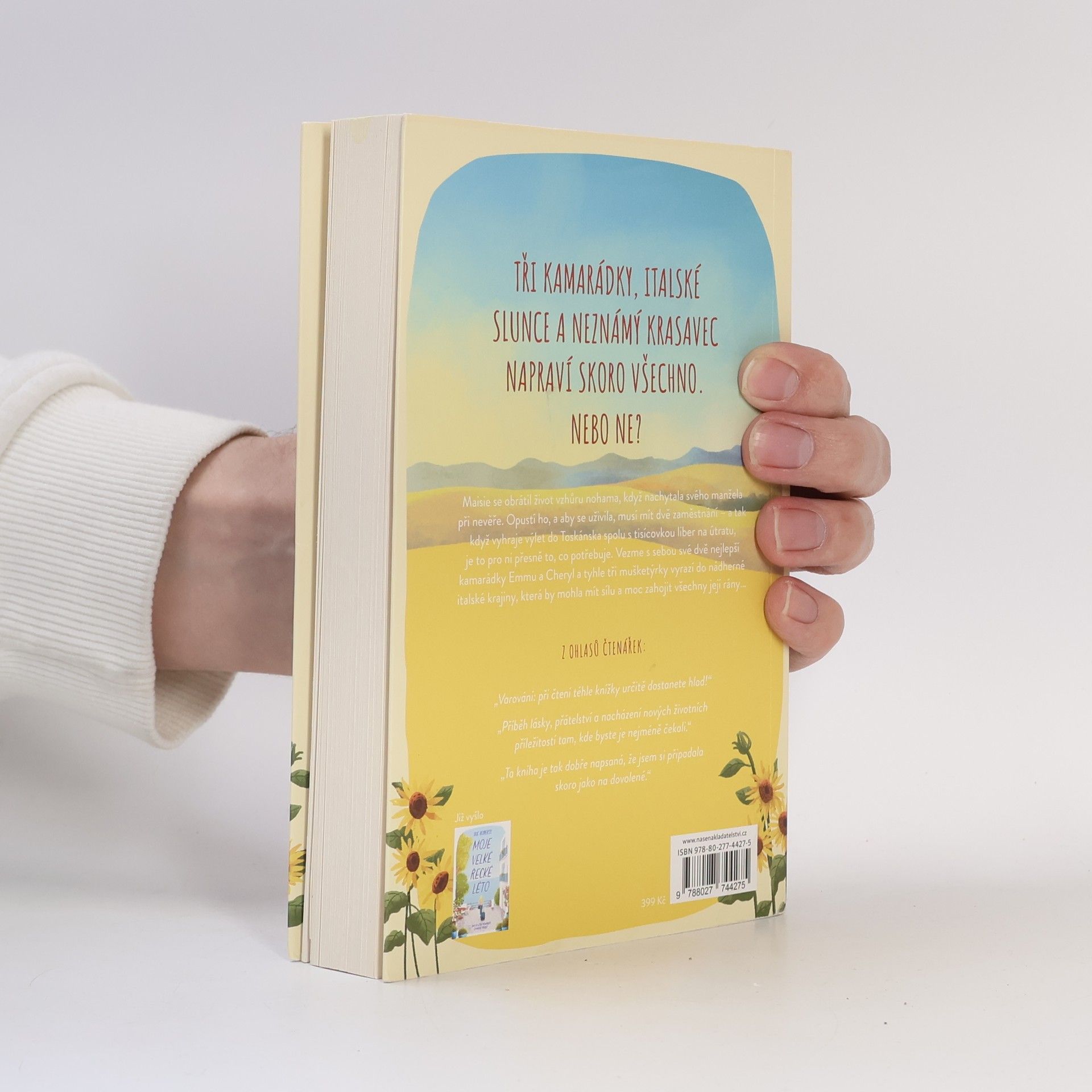 Maisie Knightová má všechno. Úžasného manžela. Úspěšný podnik. Krásný domov.Jenže jednoho dne o všechno přijde – načapá svého manžela při nevěře. Když ale vyhraje dovolenou v Itálii, nemůže se týdne pod toskánským sluníčkem dočkat.Se svými nejlepšími kamarádkami Cheryl a Emmou, které vezme s sebou, vyrazí na dámskou jízdu do vily Marisa. Pole zlatých slunečnic by mohla být dokonalým lékem na Maisiino zlomené srdce – a místní farmář, podezřele dokonalý Gianni s hustými černými vlasy a usměvavýma očima, jí poskytne vítané rozptýlení.Rána, kdy ji probouzí vůně čerstvé kávy, pohledy na zvlněné kopce, jízdy na mopedu s přidrzlými Italy a báječné těstoviny s proseccem Maisie pomůžou zapomenout na její problémy. Samotnou ji překvapí, že po tom všem trápení, které zažila, začne důvěřovat Giannimu – a ještě víc ji udiví žár, který ji v jeho přítomnosti zaplavuje, a není to vinou horkého italského slunce…Na tak krásný život by si Maisie dokázala zvyknout, ale zrovna když se jí vrací jiskra, stane se něco strašného. V jediném okamžiku ji dohoní minulost, otevře staré rány a Maisie musí učinit rozhodnutí, které jí změní život. Má se snad rozloučit s létem plným lásky a limoncella?