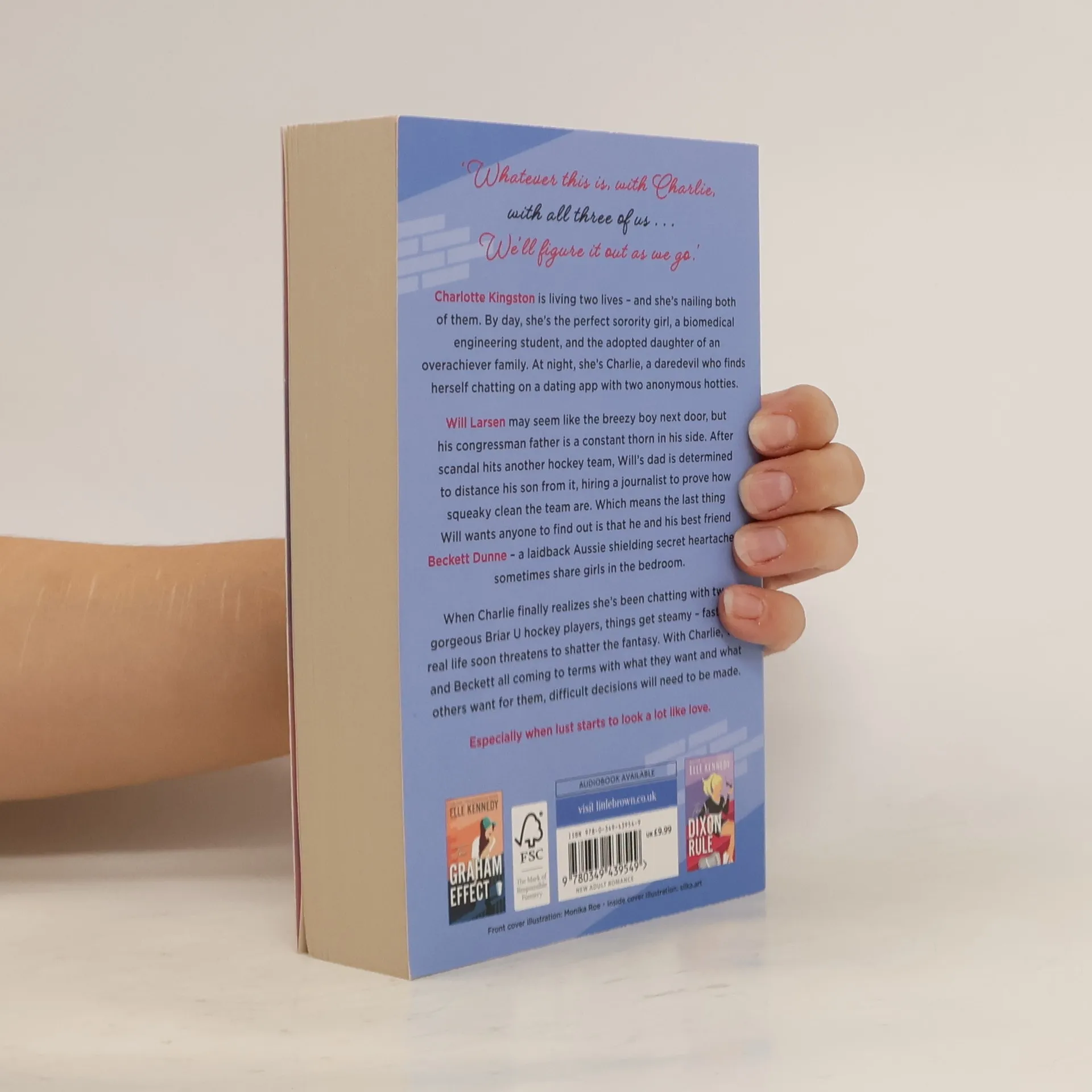 The third in the steamy, hilarious Campus Diaries series by New York Times bestselling author Elle Kennedy, set in the same world as Off Campus and Briar U.College senior Charlotte Kingston is living two lives―and she's nailing both of them. By day, she's the perfect sorority girl, a STEM student in biomedical engineering, and the adopted daughter of an overachiever family. At night, she's Charlie: a risk-taking daredevil looking for fun who finds herself chatting on a dating app with two anonymous hotties.Will Larsen may seem like the breezy boy next door, but his congressman father is a constant thorn in his side. After a scandal hits another Division 1 hockey program, Will's dad is determined to distance his son from it, hiring a journalist to prove how squeaky-clean Will and his team are. Which means the last thing Will wants is for anyone to find out he and his best friend Beckett Dunne―a laidback Aussie shielding secret heartache―sometimes share girls in the bedroom.When Charlie finally meets them in person and realizes she's been chatting with two gorgeous Briar U hockey players, things get steamy―fast. But all their messy secrets are piling up, and real life soon threatens to shatter the fantasy. With Charlie, Will, and Beckett all coming to terms with what they want and what others want for them, difficult decisions will need to be made.Especially when lust starts to look a lot like love.