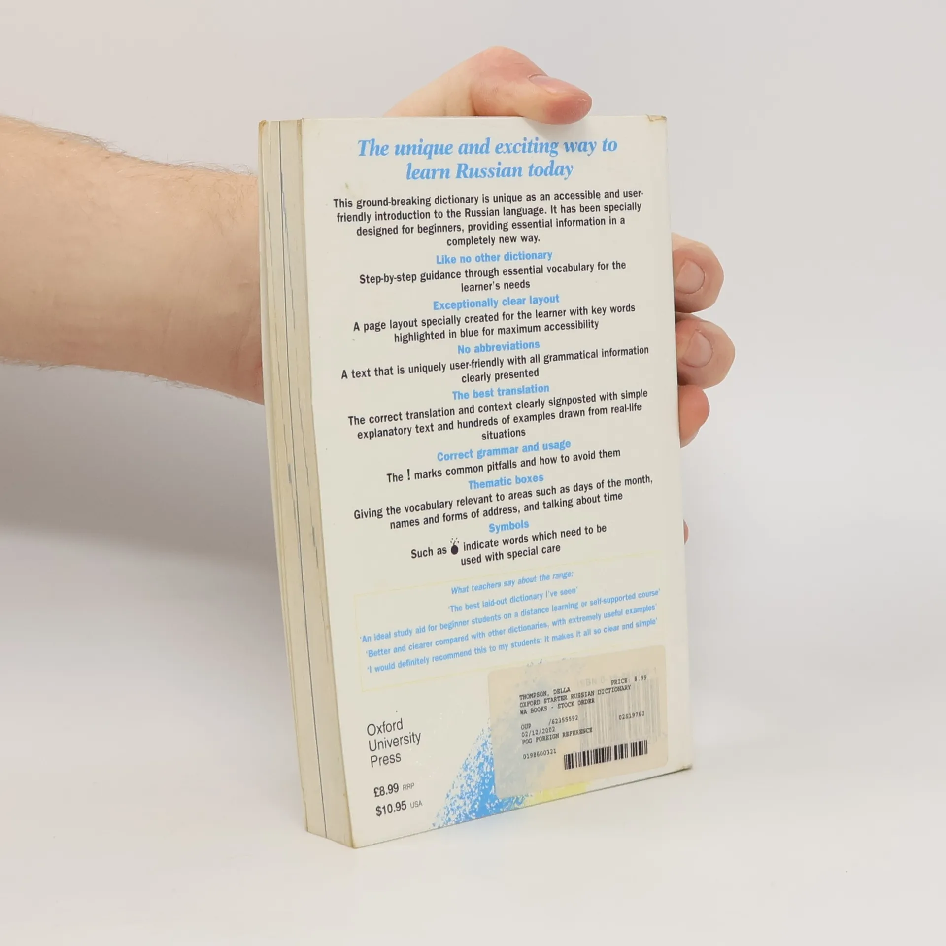 This revolutionary dictionary strips away the clutter, to provide absolute beginners with the information they need in a clear and quickly accessible way.two way: Russian-English/English-Russianessential vocabulary for beginnerseasily recognisable symbols are used to identify translations, important grammar points, colloquial words, and offensive wordsthematic boxes provide vocabulary relevant to everyday topics like names and forms of address, and talking about time12 page guide to grammar, spelling, declensions and conjugations, and the Russian alphabetcolour headwords.