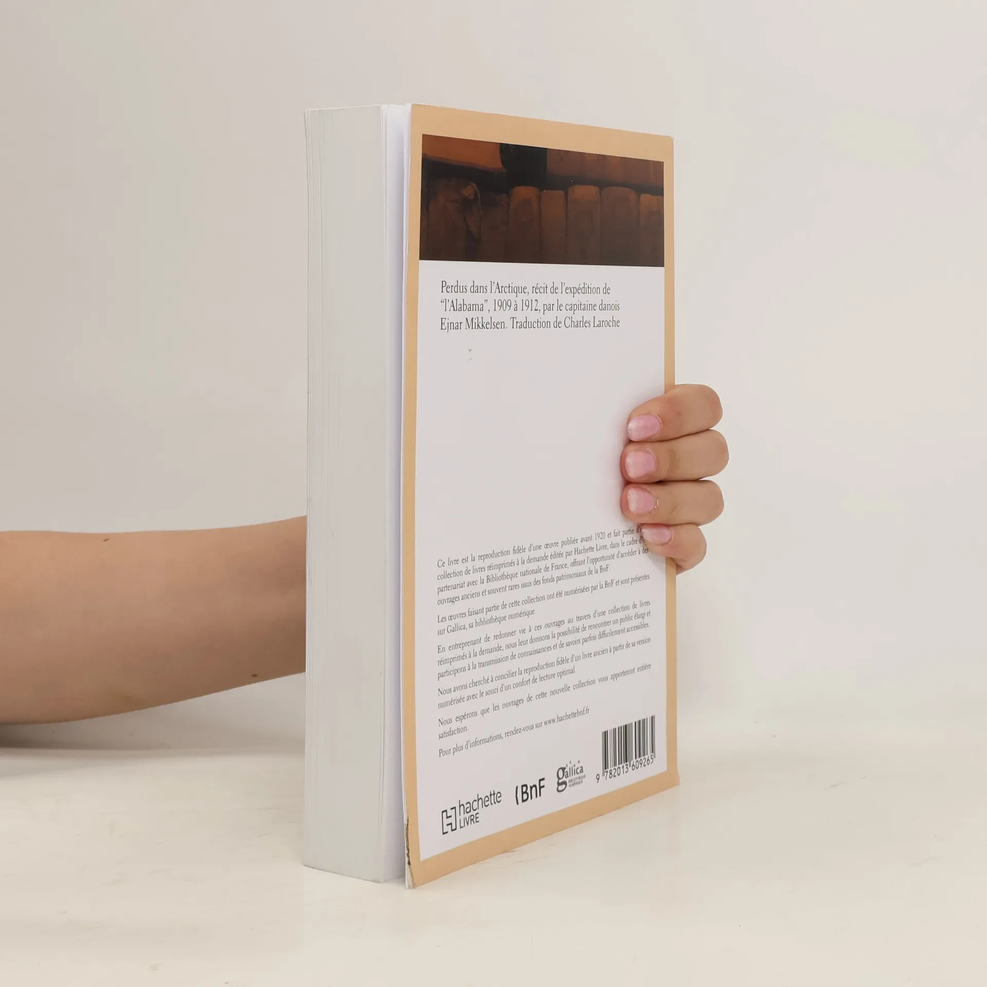 Perdus dans l'Arctique, récit de l'expédition de "l'Alabama", 1909 à 1912, par le capitaine danois Ejnar Mikkelsen. Traduction de Charles LarocheDate de l'édition originale : 1913Sujet de l'ouvrage : ArctiqueLe présent ouvrage s'inscrit dans une politique de conservation patrimoniale des ouvrages de la littérature Française mise en place avec la BNF.HACHETTE LIVRE et la BNF proposent ainsi un catalogue de titres indisponibles, la BNF ayant numérisé ces œuvres et HACHETTE LIVRE les imprimant à la demande.Certains de ces ouvrages reflètent des courants de pensée caractéristiques de leur époque, mais qui seraient aujourd'hui jugés condamnables.Ils n'en appartiennent pas moins à l'histoire des idées en France et sont susceptibles de présenter un intérêt scientifique ou historique.Le sens de notre démarche éditoriale consiste ainsi à permettre l'accès à ces œuvres sans pour autant que nous en cautionnions en aucune façon le contenu.Pour plus d'informations, rendez-vous sur www.hachettebnf.fr