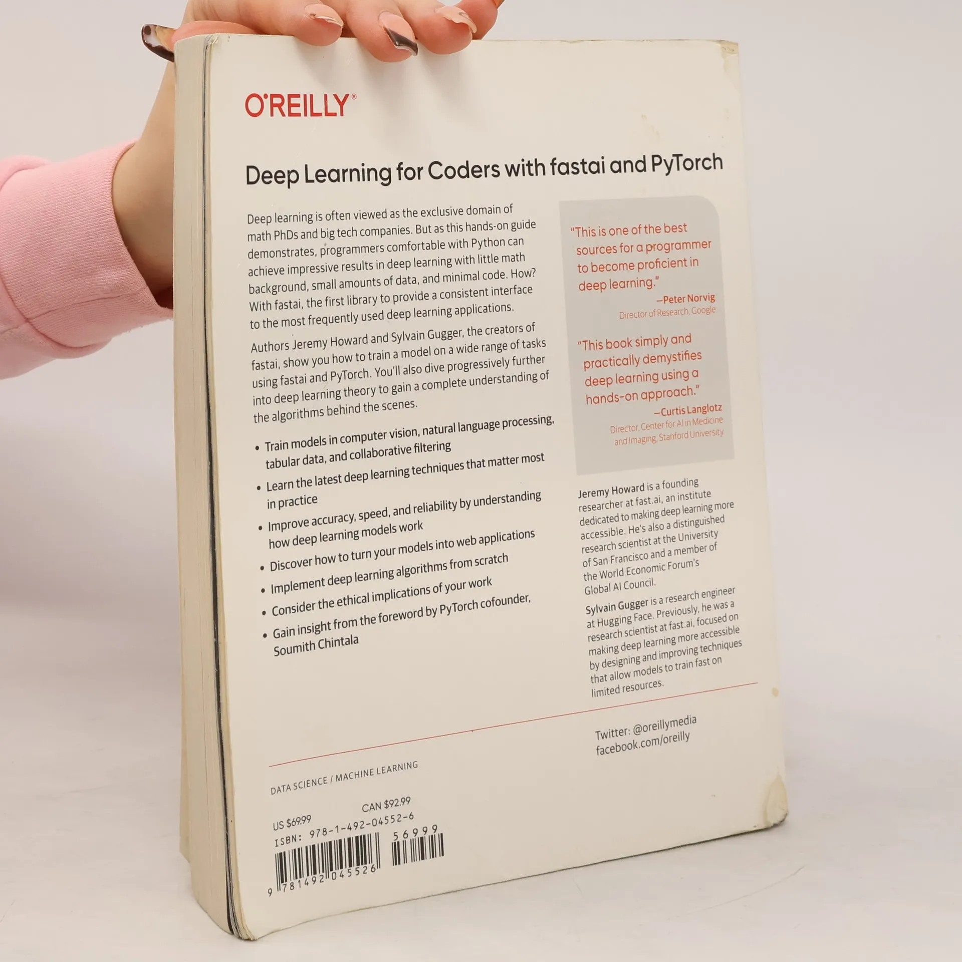 Deep learning is often viewed as the exclusive domain of math PhDs and big tech companies. But as this hands-on guide demonstrates, programmers comfortable with Python can achieve impressive results in deep learning with little math background, small amounts of data, and minimal code. How? With fastai, the first library to provide a consistent interface to the most frequently used deep learning applications. Authors Jeremy Howard and Sylvain Gugger show you how to train a model on a wide range of tasks using fastai and PyTorch. You'll also dive progressively further into deep learning theory to gain a complete understanding of the algorithms behind the scenes. Train models in computer vision, natural language processing, tabular data, and collaborative filtering Learn the latest deep learning techniques that matter most in practice Improve accuracy, speed, and reliability by understanding how deep learning models work Discover how to turn your models into web applications Implement deep learning algorithms from scratch Consider the ethical implications of your work