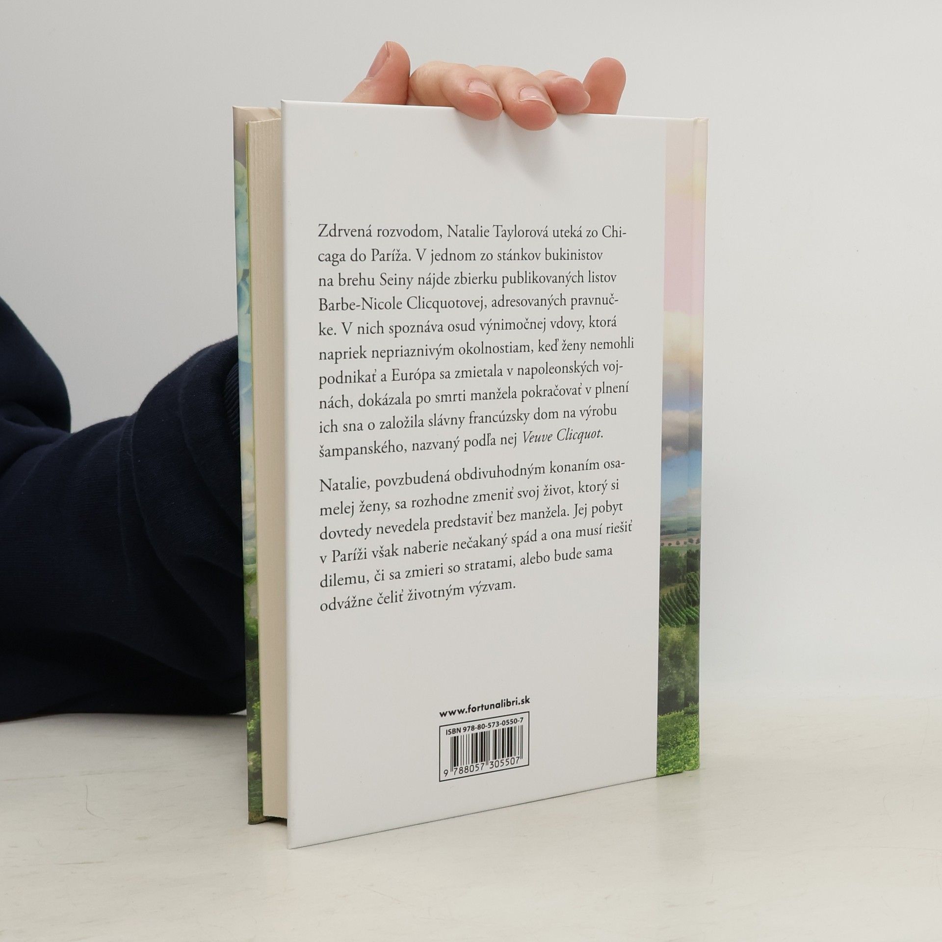 Zdrvená rozvodom, Natalie Taylorová uteká zo Chicaga do Paríža. V jednom zo stánkov bukinistov na brehu Seiny nájde zbierku publikovaných listov Barbe-Nicole Clicquotovej, adresovaných pravnučke. V nich spoznáva osud výnimoč-nej vdovy, ktorá napriek nepriaznivým okolnostiam, keď ženy nemohli podnikať a Európa sa zmietala v napoleonských vojnách, dokázala po smrti manžela po-kračovať v plnení ich sna o založila slávny francúzsky dom na výrobu šampan-ského, nazvaný podľa nej Veuve Clicquot. Natalie, povzbudená obdivuhodným konaním osamelej ženy, sa rozhodne zme-niť svoj život, ktorý si dovtedy nevedela predstaviť bez manžela. Jej pobyt v Paríži však naberie nečakaný spád a ona musí riešiť dilemu, či sa zmieri so stratami, alebo bude sama odvážne čeliť životným výzvam.