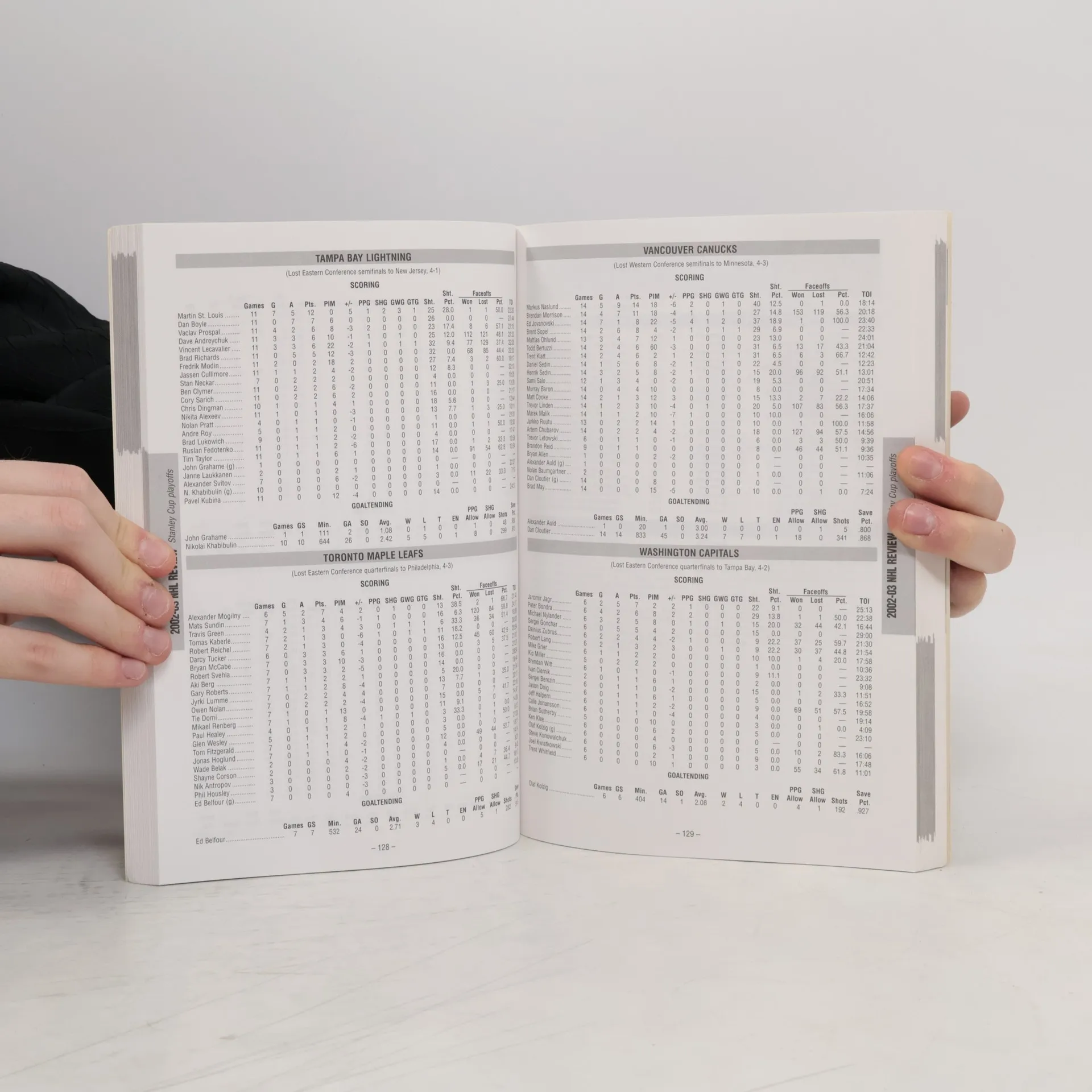 A comprehensive desk reference for hockey fans offers readers a detailed review of the 2002-2003 season, presenting team-by-team schedules, rosters, complete states and records, postseason highlights, box scores, transactions, and award winners. Original.