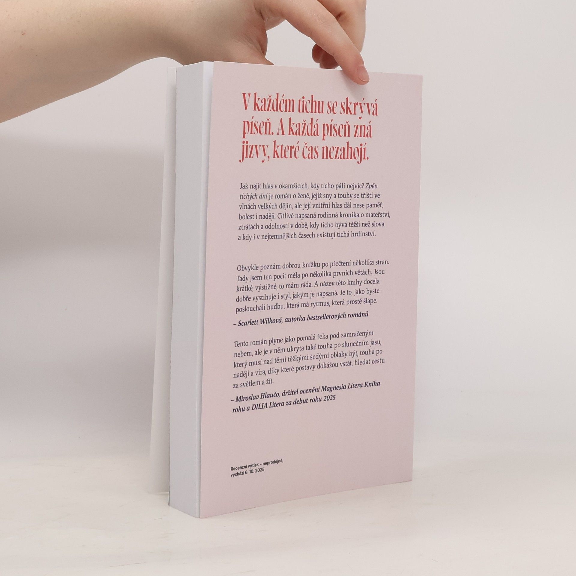 Jak najít hlas v okamžicích, kdy ticho pálí nejvíc? Zpěv tichých dní je román o ženě, jejíž sny a touhy se tříští ve vlnách velkých dějin, ale její vnitřní hlas dál nese paměť, bolest i naději. Citlivě napsaná rodinná kronika o mateřství, ztrátách a odolnosti v době, kdy ticho bývá těžší než slova a kdy i v nejtemnějších časech existují tichá hrdinství. Křehký, intimní příběh inspirovaný osudy autorčiny rodiny.