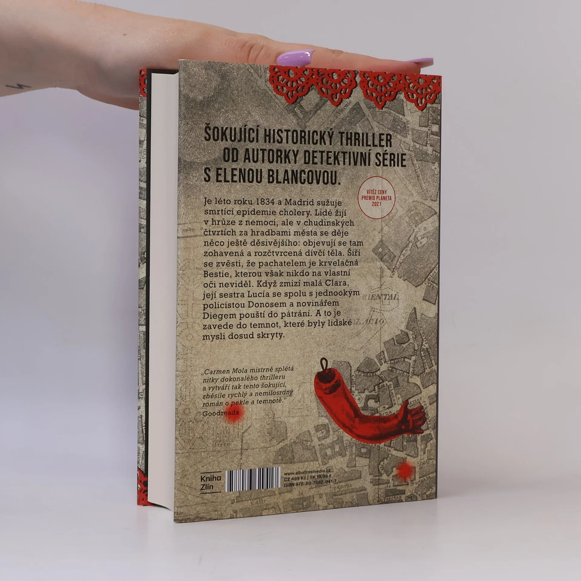 Šokující historický thriller od autorky detektivní série s Elenou Blancovou. Vítěz ceny Premio Planeta 2021. Je léto roku 1834 a Madrid sužuje smrtící epidemie cholery. Lidé žijí v hrůze z nemoci, ale v chudinských čtvrtích za hradbami města se děje něco ještě děsivějšího: objevují se tam zohavená a rozčtvrcená dívčí těla. Šíří se zvěsti, že pachatelem je krvelačná Bestie, kterou však nikdo na vlastní oči neviděl. Když zmizí malá Clara, její sestra Lucía se spolu s jednookým policistou Donosem a novinářem Diegem pouští do pátrání. A to je zavede do temnot, které byly lidské mysli dosud skryty.