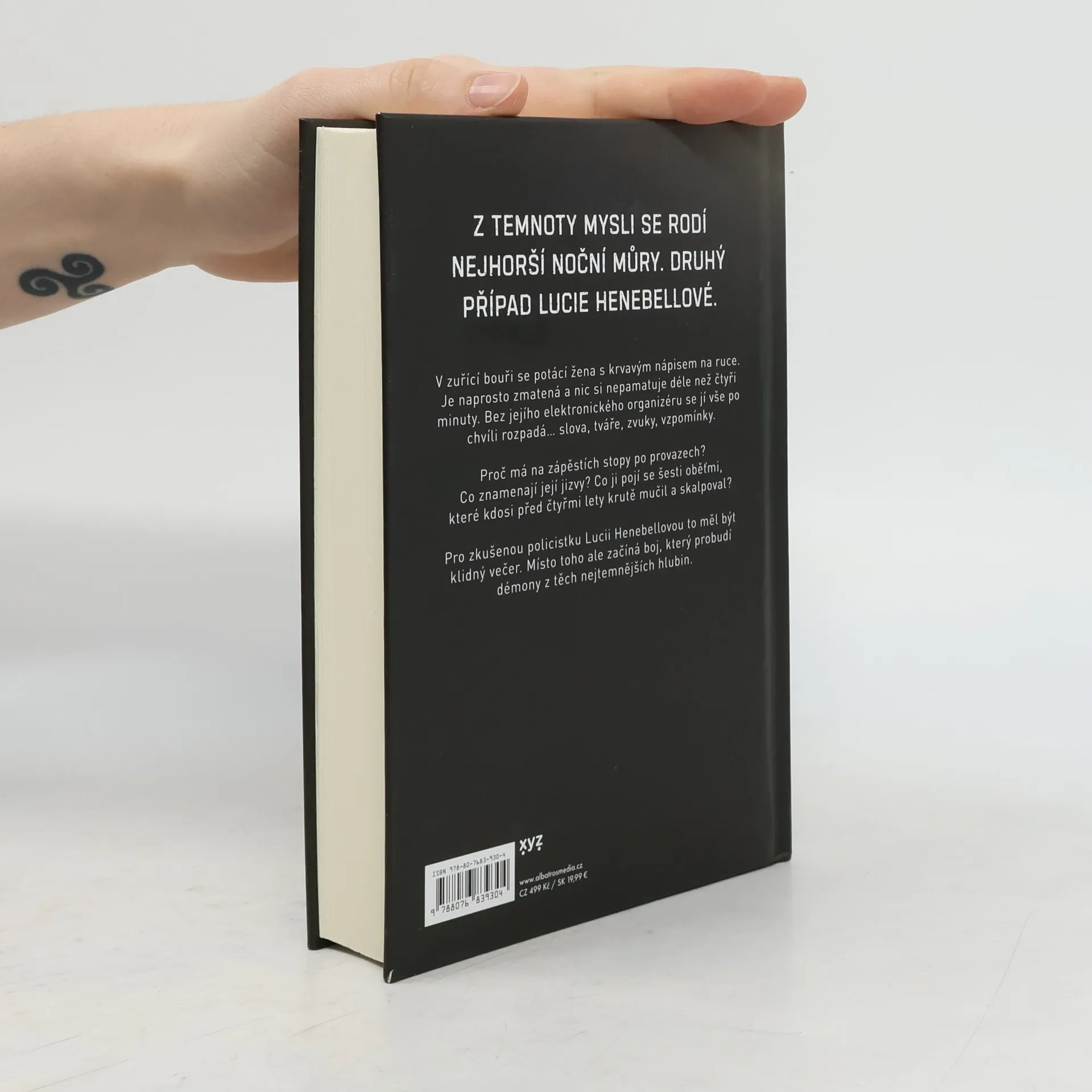 V zuřící bouři se potácí žena s krvavým nápisem na ruce. Je naprosto zmatená a nic si nepamatuje déle než čtyři minuty. Bez jejího elektronického organizéru se jí vše po chvíli rozpadá… slova, tváře, zvuky, vzpomínky. Proč má na zápěstích stopy po provazech? Co znamenají její jizvy? Co ji pojí se šesti oběťmi, které kdosi před čtyřmi lety krutě mučil a skalpoval? Pro zkušenou policistku Lucii Henebellovou to měl být klidný večer. Místo toho ale začíná boj, který probudí démony z těch nejtemnějších hlubin.