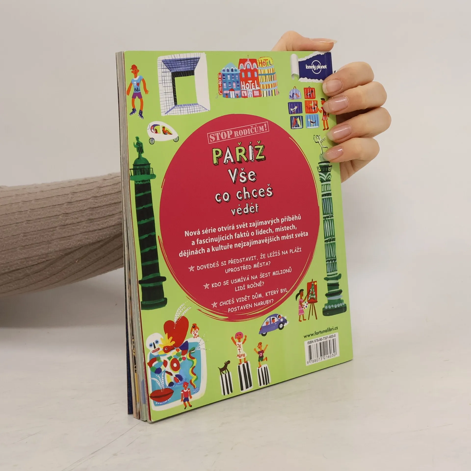 Série Stop rodičům! otvírá svět zajímavých příběhů a fascinujících faktů o lidech, místech, dějinách a kultuře nejzajímavějších měst světa. Dovedeš si představit, že ležíš na pláži uprostřed města? Kdo se usmívá na šest milionu lidí ročně? Chceš vidět dům, který byl postaven naruby? Netradiční a trochu provokativní průvodce pro náctileté.