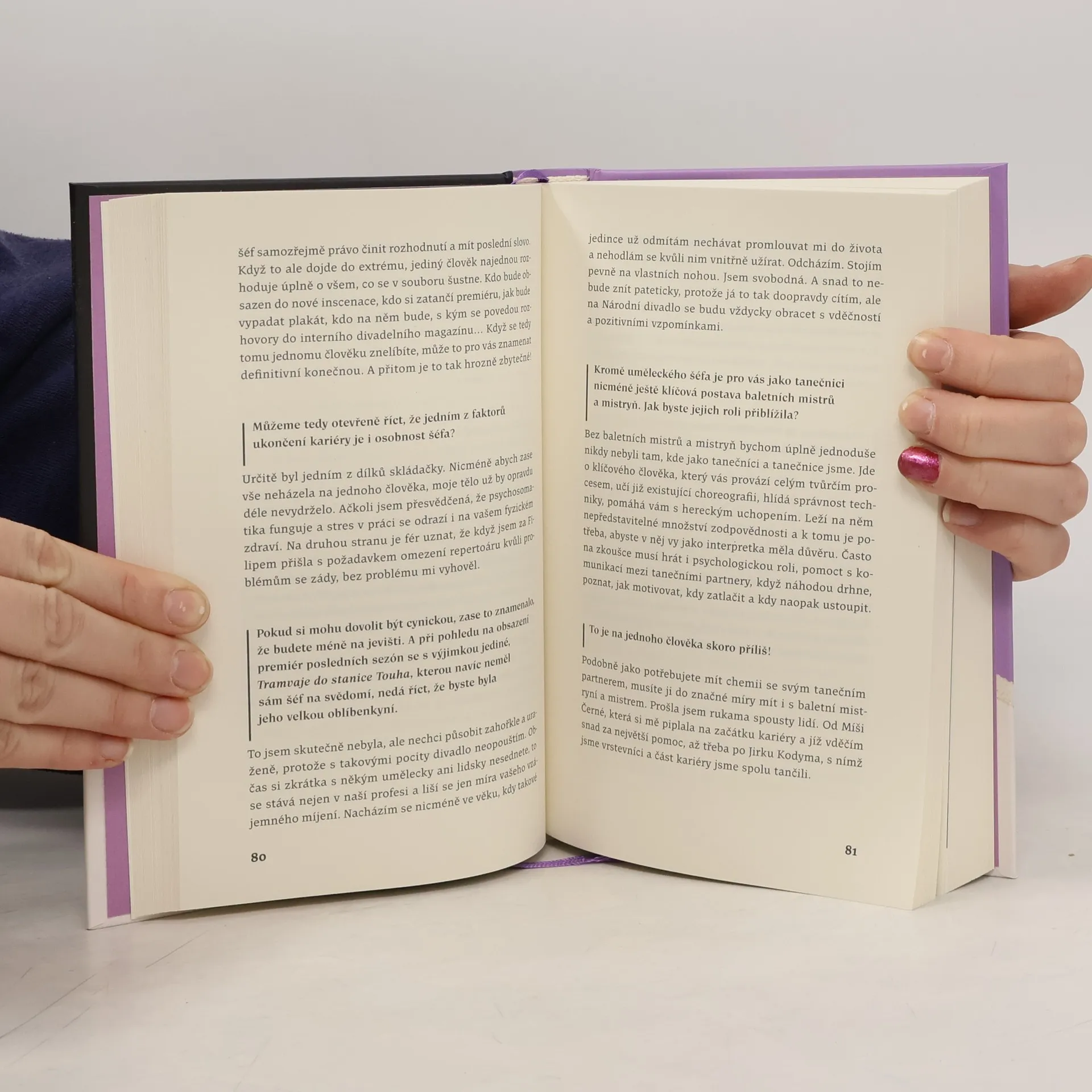 Nikola Márová se stala hvězdou své generace a neochvějnou stálicí baletního souboru pražského Národního divadla, na jehož vrcholu coby primabalerína stála téměř dvacet let. Její kariéra byla ověnčená úspěchy v podobě cen, slavných rolí, setkání s choreografickými osobnostmi formátu Jiřího Kyliána, Matse Eka nebo Johna Neumeiera, i mimořádným kritickým ohlasem. Oceňována byla čistota její klasické techniky, elegance křivek jejího těla, jedinečné charisma i pokora, vůle a ochota dřít. Podobné věci se ale říkají téměř o každé primabaleríně. Čím je tedy Nikola Márová jedinečná? Snad celoživotním bojem se špatně zahojeným rozdrceným loktem. Snad oblibou v tetování. Snad extrémní láskou ke zvířatům, kdy v dětství zachraňovala šneky na silnici a z akvária vyskočivší rybičky na koberci. Balet Nikolu formoval a provázel celým životem, přesto se odmítá onálepkovat pouze štítkem primabaleríny. Je matkou, dcerou a sestrou s extrémně silným vztahem k rodině. Je milovnicí přírody a čajových rituálů. Je tichou silou i křehkou duší. V průřezovém rozhovoru přibližuje svůj život uvnitř i vně nenapodobitelného světa baletu s upřímnou otevřeností. Celkový obrázek doplňují vzkazy vybraných osobností, které Nikolu Márovou dokreslují nejen jako taneční profesionálku, ale především jako člověka.